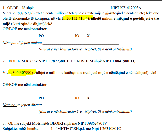 NdĂ«rkaq, oferta e oferta e operatorit “BE – IS “ shpk Ă«shtë  29 807 690 lekĂ« dhe me vlerĂ« tĂ« korrigjuar nĂ« shifrĂ«n 30 153 410 lekĂ«. NdĂ«rsa kompania “K.M.K” shpk ka propozuar ta bĂ«jĂ« kĂ«tĂ« punĂ« me 30 430 990 lekĂ« pa TVSH.