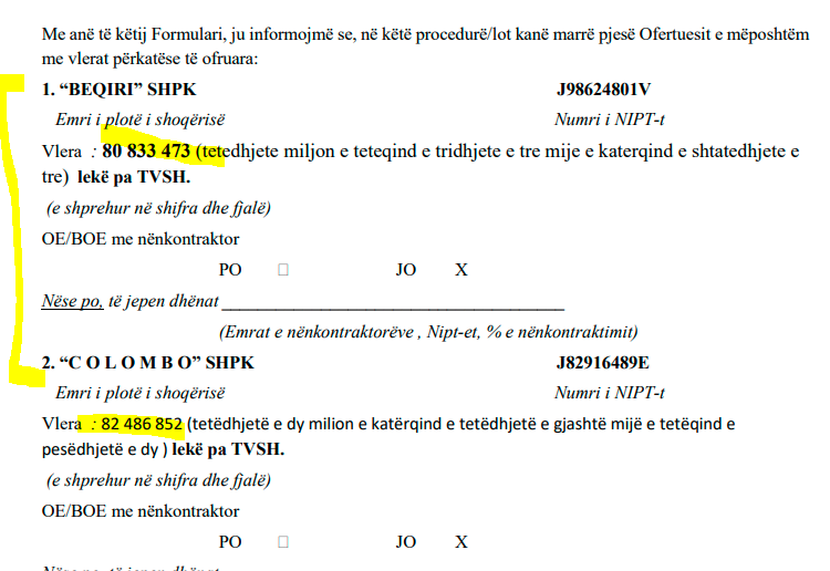 Sipas dokumenteve, nĂ« kĂ«tĂ« procedurĂ« kanĂ« marrĂ« pjesĂ« operatorĂ« “konkurrues”: “BEQIRI” SHPK me pronar Neim Beqirajn dhe “C O L O M B O” SHPK, me pronare Diana Laba.