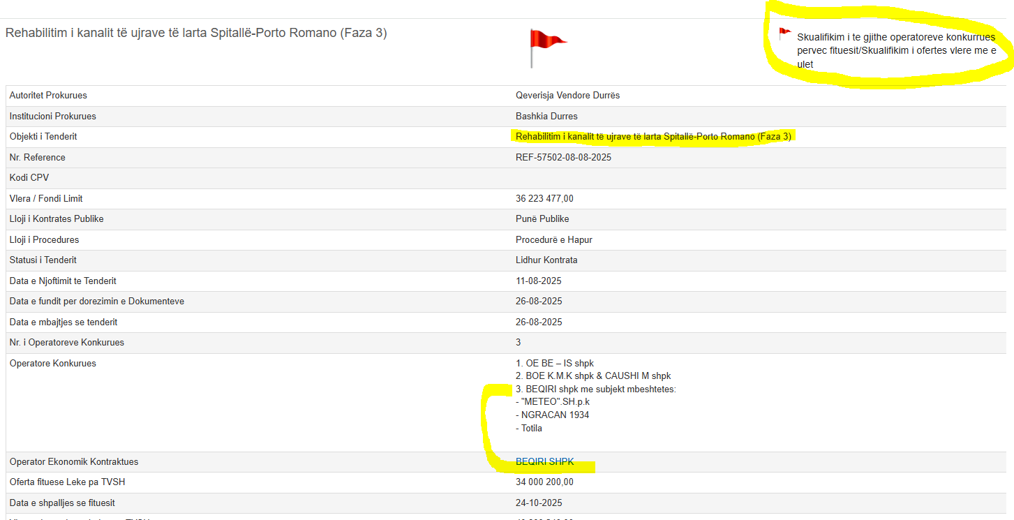 NĂ« fakt, arsye e skualifikimit tĂ« dy ofertave Ă«shtĂ« se ato janĂ« mĂ« tĂ« ulĂ«ta se propozimi qĂ« kishte bĂ«rĂ« kompania e Neim Beqirajt. “BEQIRI” SHPK ka bĂ«rĂ« ofertĂ«n 34 000 200,00 lekĂ« pa TVSH.