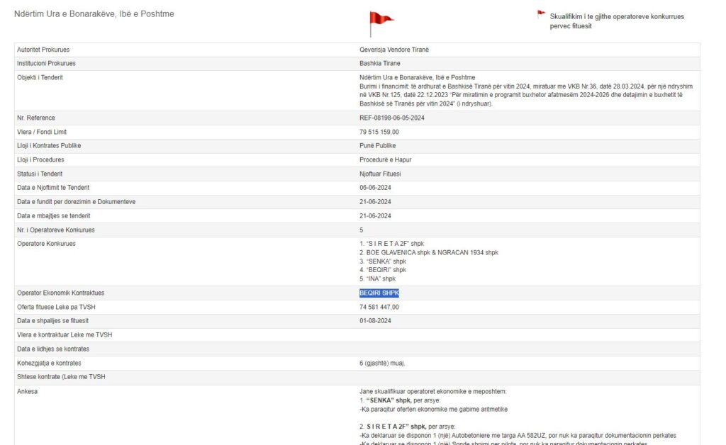 KĂ«shtu, mĂ« 25 qershor 2024, kryebashkiaku Erion veliaj i ka dhĂ«nĂ« Neim Beqirit tenderin me vlerĂ« afĂ«rsisht 1 milion euro me objekt ‘NdĂ«rtim Ura e BonarakĂ«ve, IbĂ« e Poshtme’.