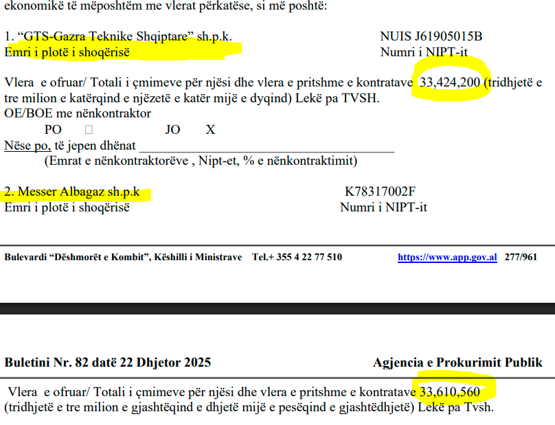 Sipas dokumenteve tĂ« tenderit, âGTS-Gazra Teknike Shqiptareâ sh.p.k. ka bĂ«rĂ« ofertĂ«n 33,424,200 LekĂ« pa TVSH. NdĂ«rsa âMesser Albagazâ sh.p.k ka vlerĂ«n 33,610,560 LekĂ« pa Tvsh.