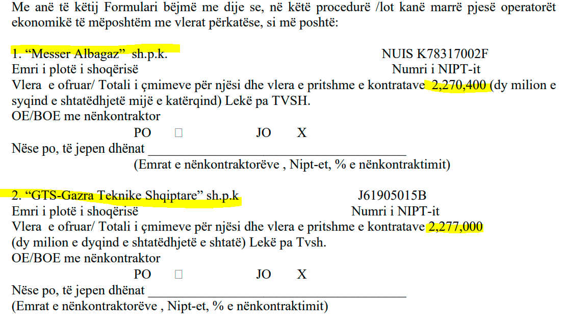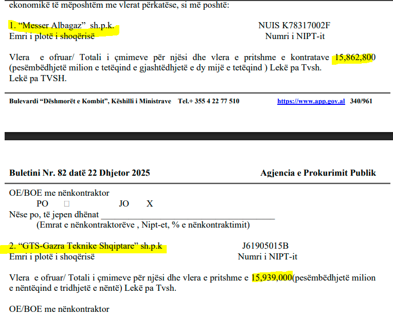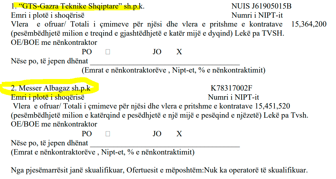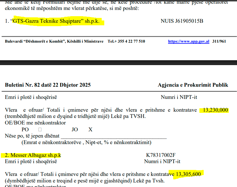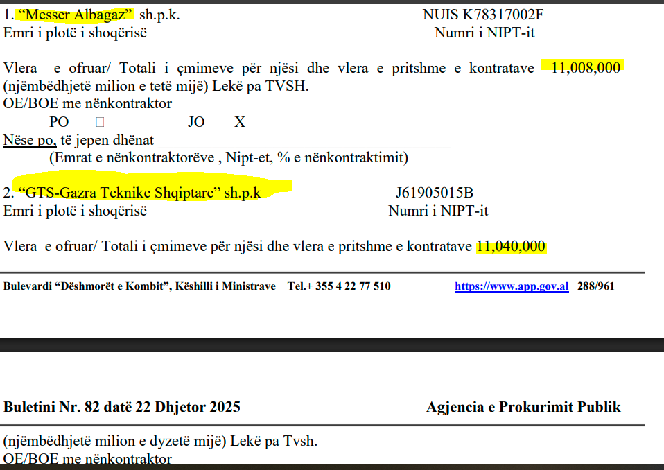 Kompania âMesser Albagazâ sh.p.k. ka bĂ«rĂ« ofertĂ«n 11,008,000 LekĂ« pa TVSH. NdĂ«rsa âGTS-Gazra Teknike Shqiptareâ sh.p.k ka bĂ«rĂ« ofertĂ« disa lekĂ« mĂ« tepĂ«r: 11,040,000 lekĂ« pa TVSH.