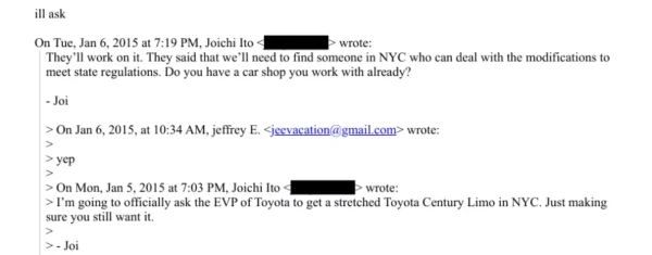 Në fund të vitit 2014 dhe fillim të vitit 2015, Epstein ishte i interesuar të blinte një Toyota Century.