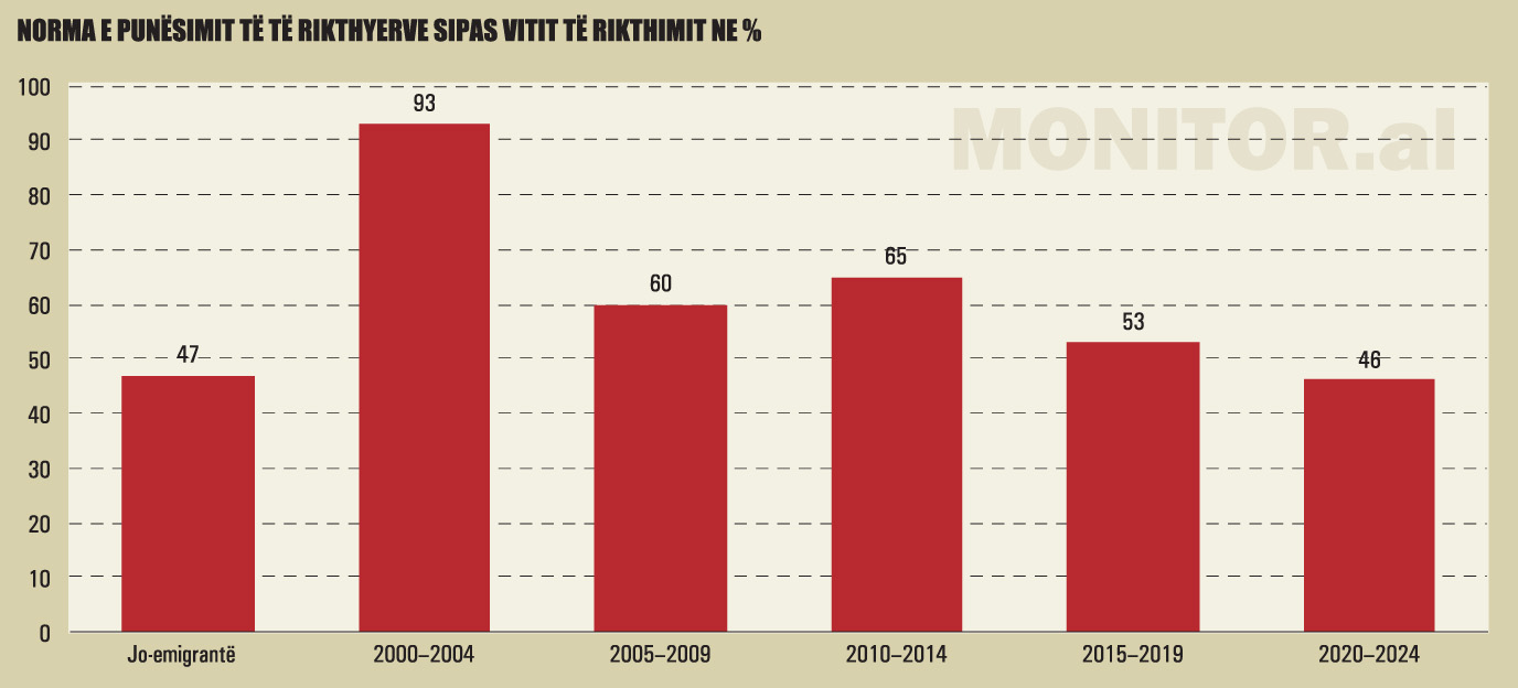 Norma mĂ« e ulĂ«t e punĂ«simit, 46%, vĂ«rehet tek emigrantĂ«t e kthyer nĂ« periudhĂ«n 2020â2024, duke treguar sfida mĂ« tĂ« mĂ«dha pĂ«r riintegrimin afatshkurtĂ«r nĂ« tregun e punĂ«s.