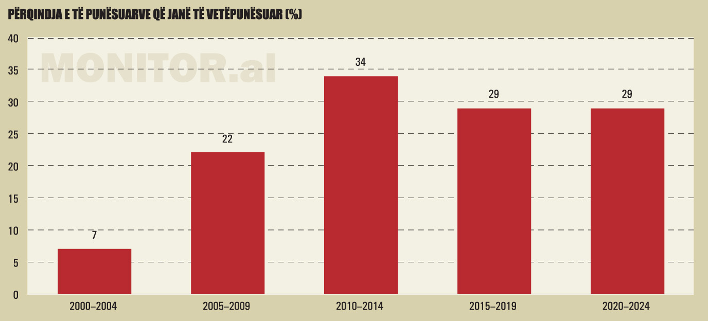 Pesha e tĂ« vetĂ«punĂ«suarve rritet nga vetĂ«m 7% e atyre qĂ« u kthyen nĂ« periudhĂ«n 2000â2004, nĂ« 22% pĂ«r 2005â2009, duke arritur kulmin nĂ« 34% pĂ«r grupin 2010â2014 dhe duke u stabilizuar rreth 29% pĂ«r kohortat mĂ« tĂ« fundit (2015â2024).