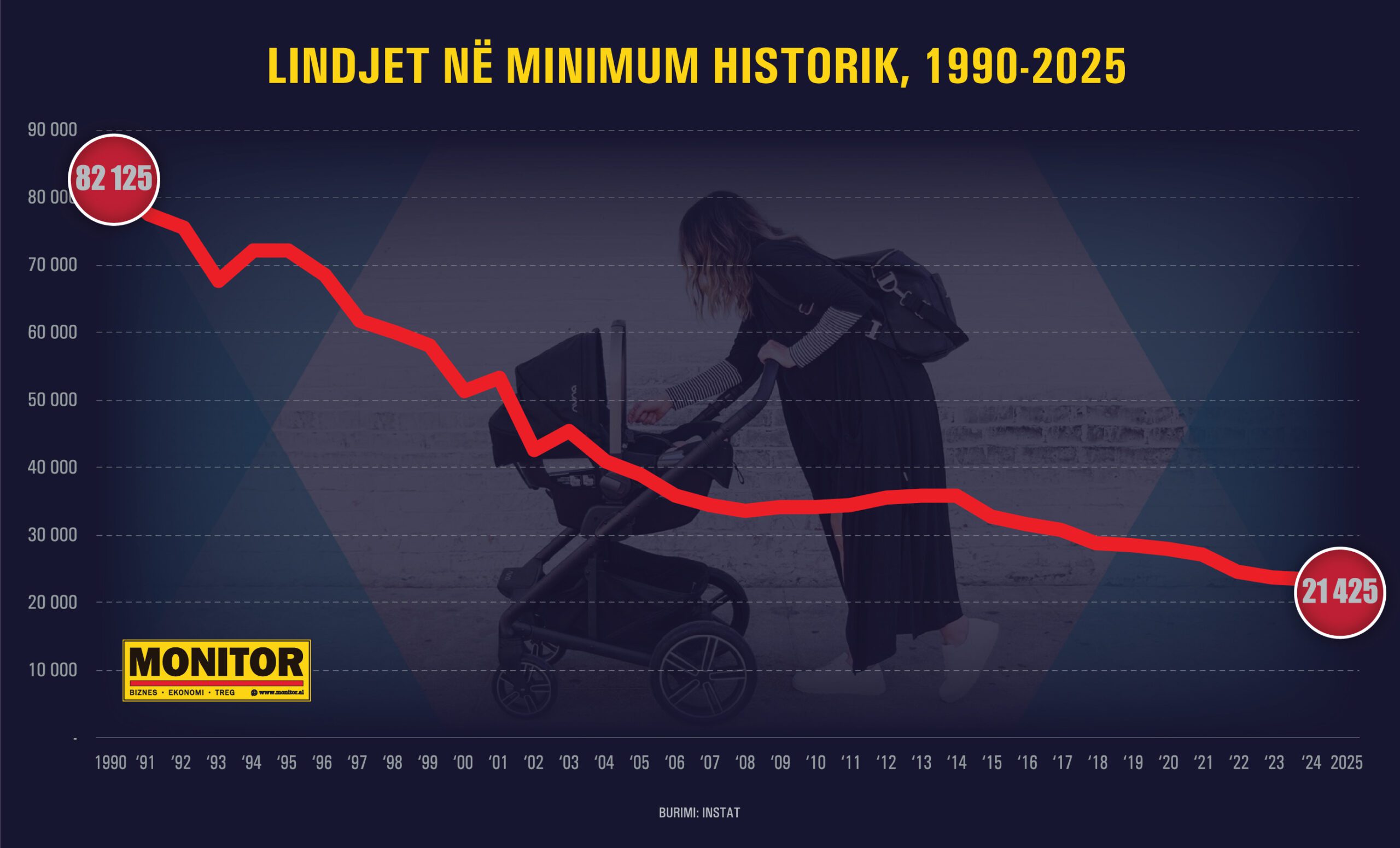 ShqipĂ«ria po pĂ«rjeton njĂ« nga krizat mĂ« tĂ« thella demografike nĂ« historinĂ« e saj modern. Shifrat e fundit tĂ« vitit 2025 tregojnĂ« njĂ« rĂ«nie drastike tĂ« numrit tĂ« lindjeve me rreth 74% krahasuar me fillimin e viteve â90, ku ShqipĂ«ria regjistronte njĂ« rekord prej 82,125 lindjesh, ndĂ«rsa 35 vite mĂ« vonĂ«, ky numĂ«r ka zbritur nĂ« nivelin kritik prej 21,425