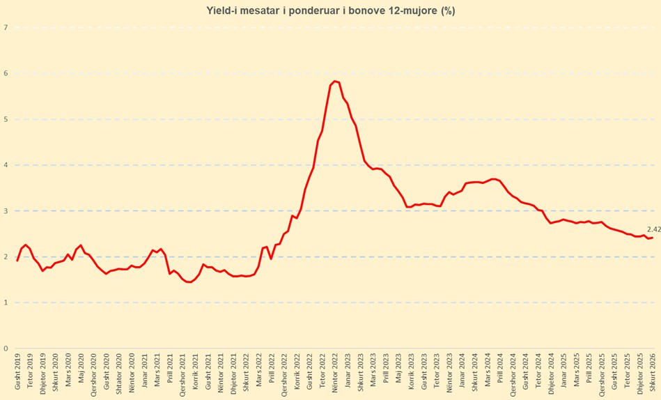 Yield-et e bonove 12-mujore ngelën në nivele të ulëta edhe në ankandin e parë të muajit shkurt. Sipas të dhënave të Bankës së Shqipërisë, yield-i mesatar i ponderuar rezultoi në nivelin 2.42%, nga 2.4% që kishte qenë në ankandin e mëparshëm.