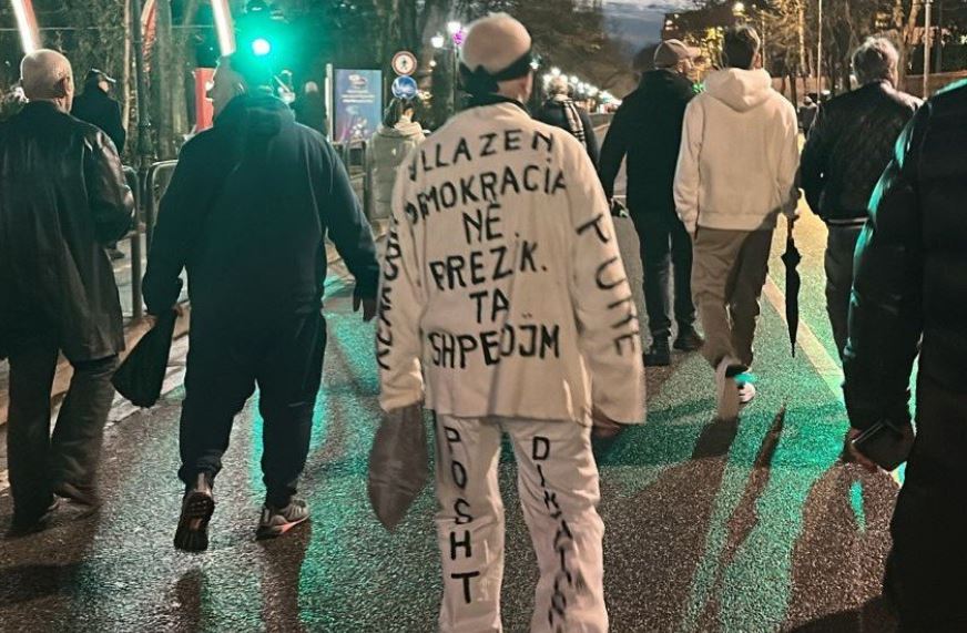 I veshur me të bardha, ai shkruan në bluzën e tij: “Vllazën, demokracia në rrezik, ta shpëtojmë”.