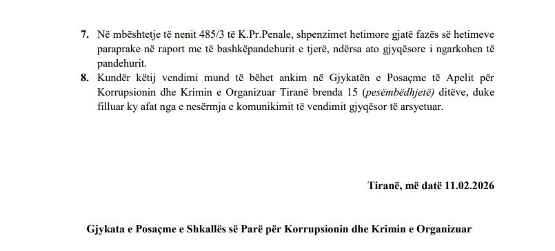 Në mbështetje të nenit 485/3 të K.Pr.Penale, shpenzimet hetimore gjatë fazës së hetimeve paraprake në raport me të bashkëpandehurit e tjerë, ndërsa ato gjyqësore i ngarkohen të pandehurit. Kundër këtij vendimi mund të bëhet ankim në Gjykatën e Posaçme të Apelit për Korrupsionin dhe Krimin e Organizuar Tiranë brenda 15 (pesëmbëdhjetë) ditëve, duke filluar ky afat nga e nesërmja e komunikimit të vendimit gjyqësor të arsyetuar. Tiranë, më datë 11.02.2026.Gjykata e Posaçme e Shkallës së Parë për Korrupsionin dhe Krimin e Organizuar”.
