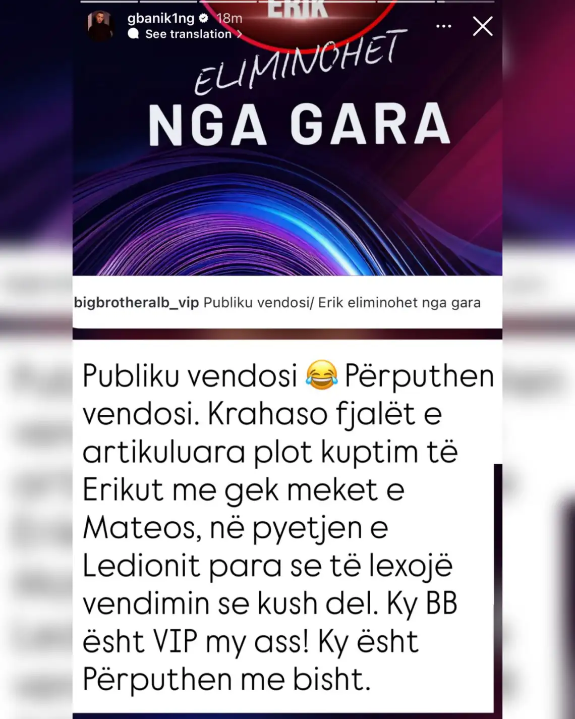 G Bani ironizon eliminimin e Erikut nga Big Brother VIP Albania: “VIP my ass!”