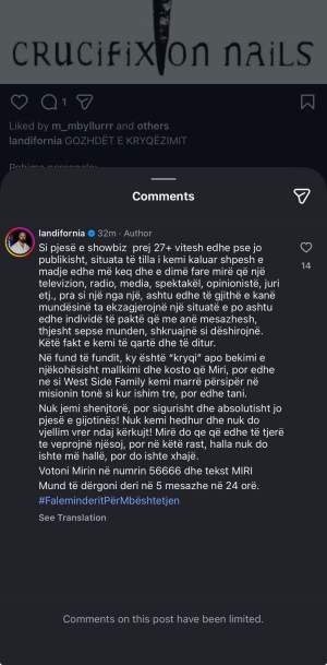 Në komentet e postimit, Landi shton se si pjesë e showbiz-it prej më shumë se 27 vitesh, ka parë shpesh situata edhe më të rënda, por kurrë një reagim kaq të ashpër ndaj një individi. Ai thekson se kritika është e pranueshme, por linçimi publik jo, duke bërë thirrje që çdo gjë të trajtohet me masë dhe përgjegjësi.