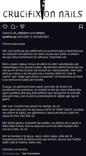 Përmes një postimi të gjatë në Instagram, Landi shprehet se sulmet ndaj Mirit janë të padrejta dhe të ekzagjeruara, duke theksuar se imazhi që po krijohet për të në rrjetet sociale nuk përkon me realitetin. Sipas tij, Miri po “kryqëzohet” publikisht për disa momente të izoluara, të interpretuara në mënyrë sipërfaqësore dhe të hiperbolizuar nga opinioni online.