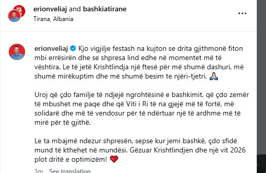 Le ta mbajmë ndezur shpresën, sepse kur jemi bashkë, çdo sfidë mund të kthehet në mundësi. Gëzuar Krishtlindjen dhe një vit 2026 plot dritë e optimizëm”, shkruan Veliaj.