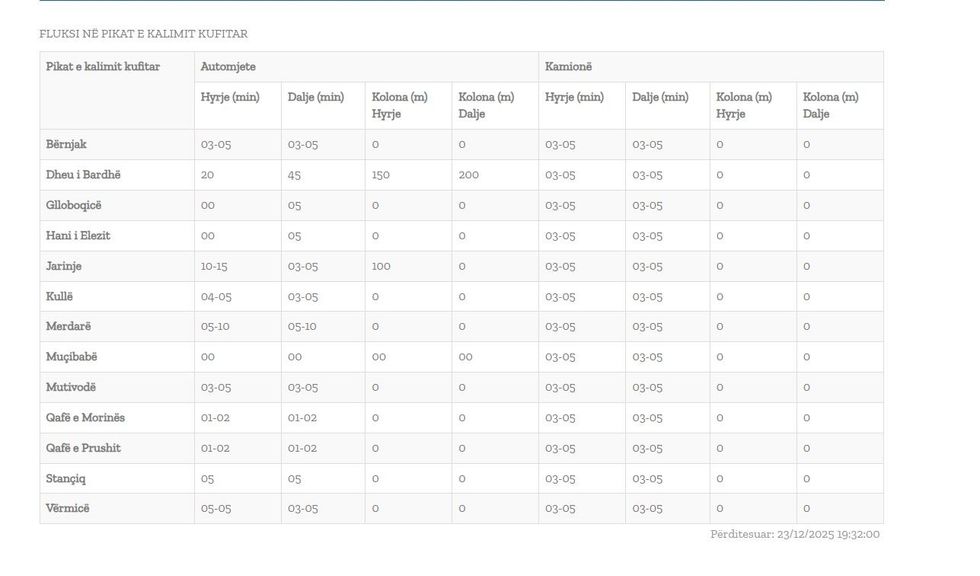 Në shumicën e pikave kufitare, koha e pritjes për automjetet sillet nga 1 deri në 5 minuta, ndërsa nuk raportohet për kolona të gjata.