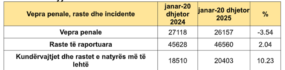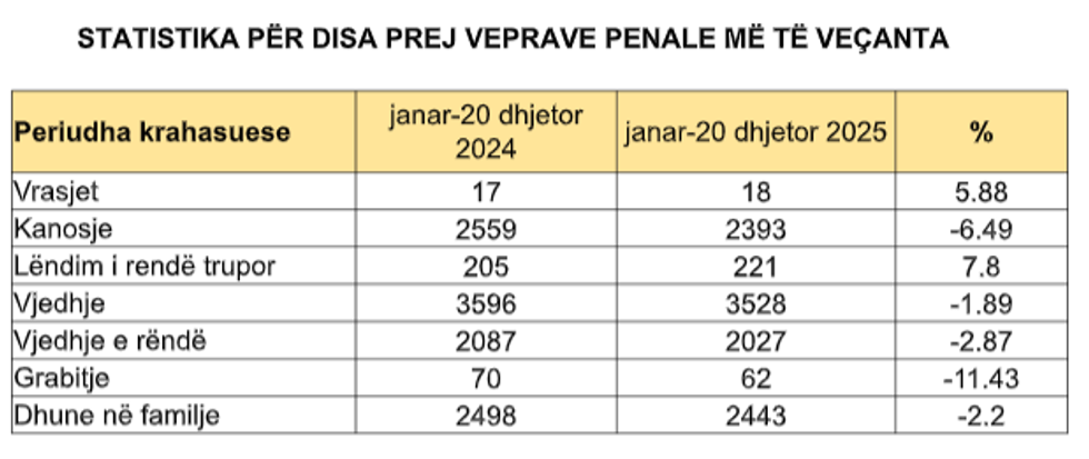 Policia e KosovĂ«s ka bĂ«rĂ« tĂ« ditur se gjatĂ« periudhĂ«s janarâ20 dhjetor janĂ« iniciuar mbi 26 mijĂ« raste pĂ«r vepra penale, qĂ« pĂ«rbĂ«n njĂ« rĂ«nie prej 3.54 pĂ«r qind krahasuar me periudhĂ«n e njĂ«jtĂ« tĂ« vitit 2024.