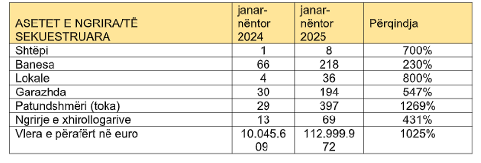 Po ashtu, sipas statistikave policore, nĂ« periudhĂ«n janarânĂ«ntor tĂ« kĂ«tij viti janĂ« ngrirĂ« dhe sekuestruar asete nĂ« vlerĂ« mbi 112 milionĂ« euro, nĂ« kuadĂ«r tĂ« hetimeve pĂ«r vepra tĂ« ndryshme penale.