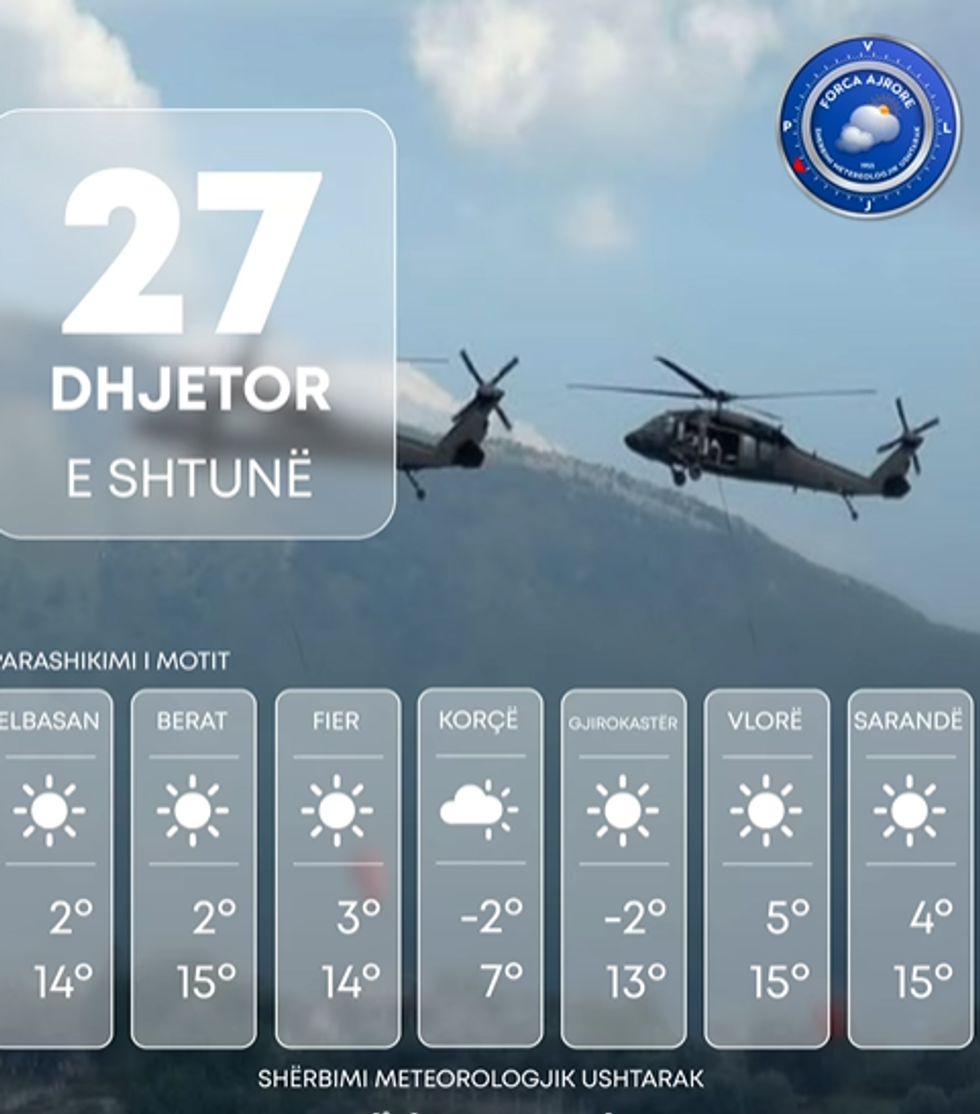 Shërbimi Meteorologjik Ushtarak bën të ditur se në Shqipëri të premten moti parashikohet me vranësira mesatare deri të dendura të cilat pas orëve të mesditës gradualisht pritet të vijnë në pakësim, dhe përqendrohen përgjatë maleve në zonën lindore, ndërsa pjesa tjetër e vendit me mot kryesisht të kthjellët.