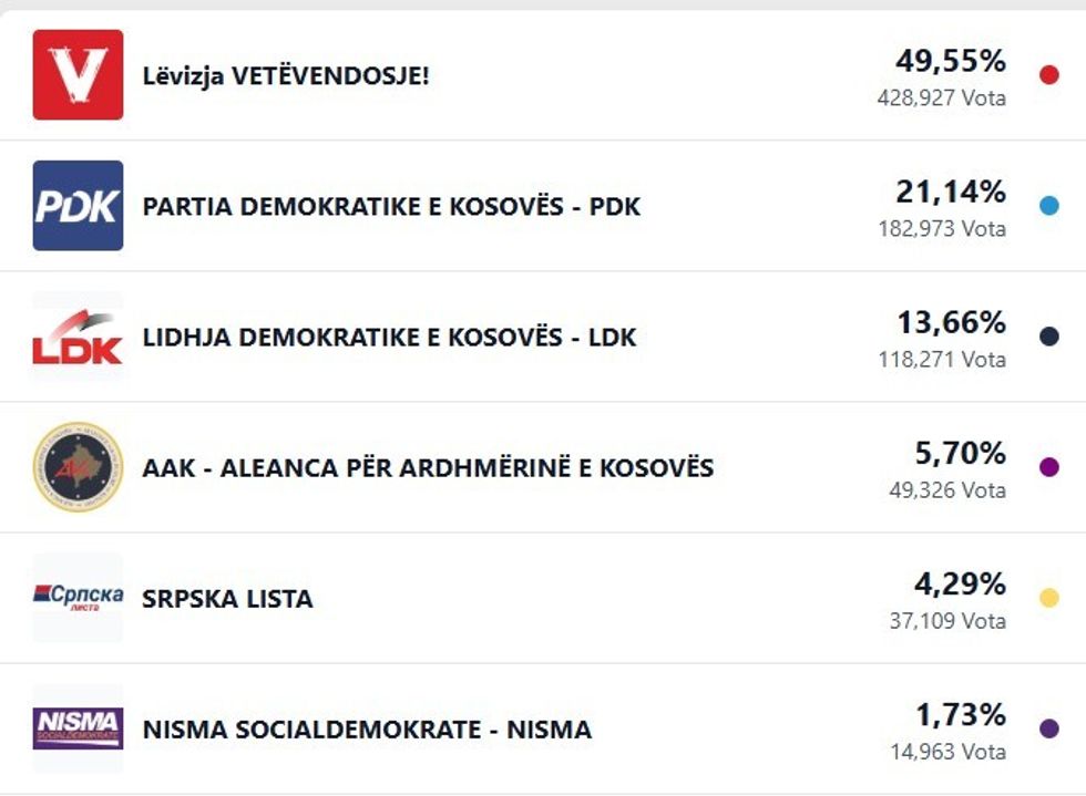 Lëvizja Vetëvendosje (VV) kryeson bindshëm si brenda Kosovës ashtu edhe në diasporë. Në Kosovë (pa diasporën), VV ka marrë 43.5% të votave, ndërsa në diasporë përqindja e saj arrin në 61.7%, duke shënuar një mbështetje dukshëm më të lartë nga mërgata.