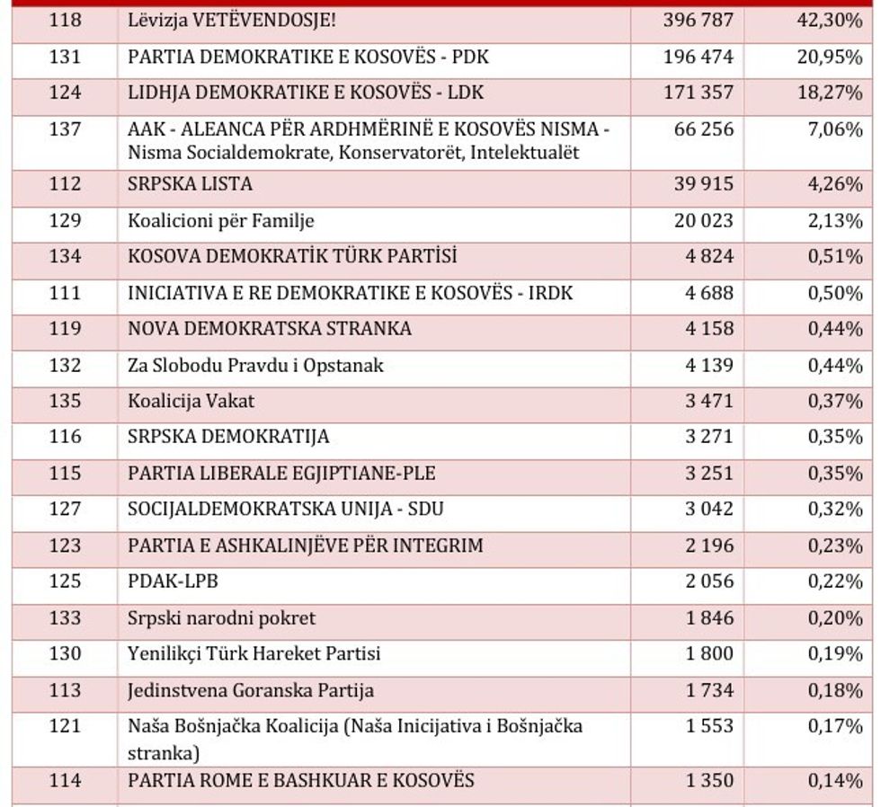 LVV nuk ka arritur të renditet e para vetëm në Skenderaj, Drenas, komuna ku kryeson PDK, dhe Deçan ku AAK ka dalë e para, ndërsa në të gjitha komunat e tjera shqiptare ka siguruar epërsinë ndaj partive rivale.