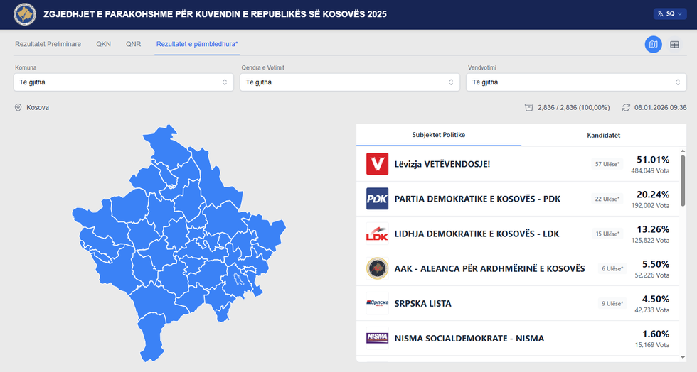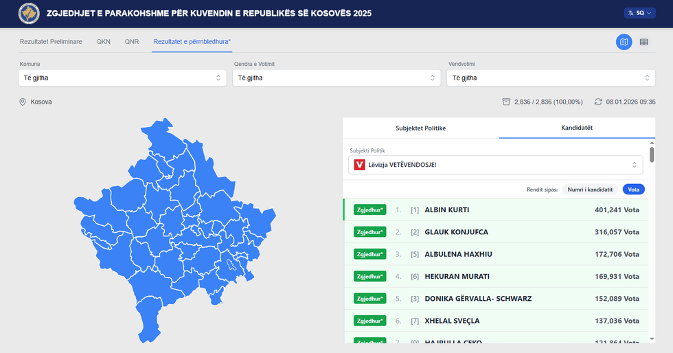 Sipas të dhënave më të fundit të publikuara nga Komisioni Qendror i Zgjedhjeve, më 8 janar 2026, në orën 09:36, kreun i Lëvizjes Vetëvendosje ka grumbulluar gjithsej 401,241 vota, ndërsa partia që drejton ka siguruar shumicën absolute të votave, me 51.01 për qind apo 484,049 vota, pas numërimit të 100 për qind të vendvotimeve, gjithsej 2,836.