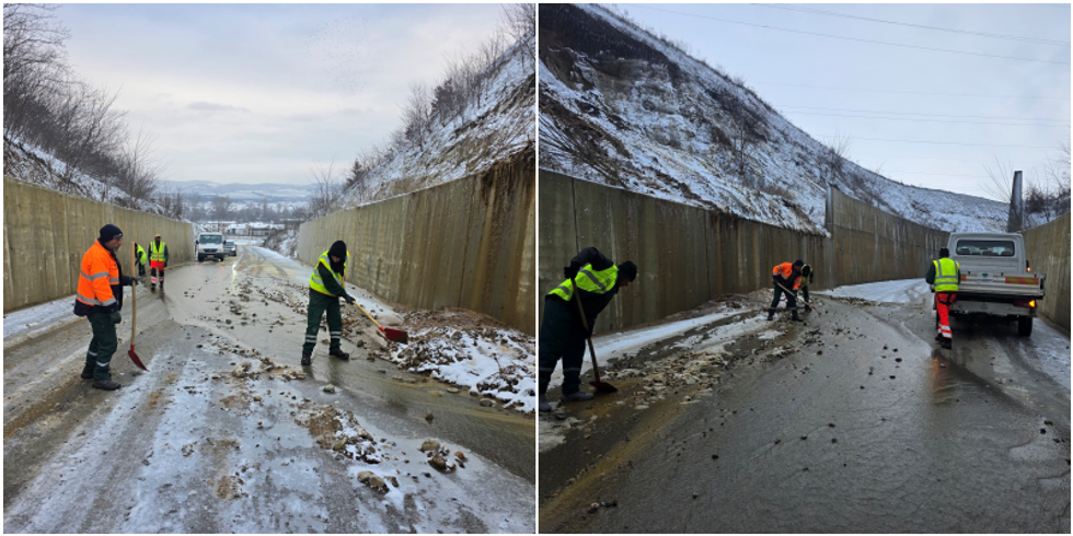Punëtorët e NPL Eko-Theranda kanë nisur punën që në orët e hershme të mëngjesit për pastrimin e rrugëve nga gurët dhe dheu i dalë si pasojë e reshjeve të ditëve të fundit.