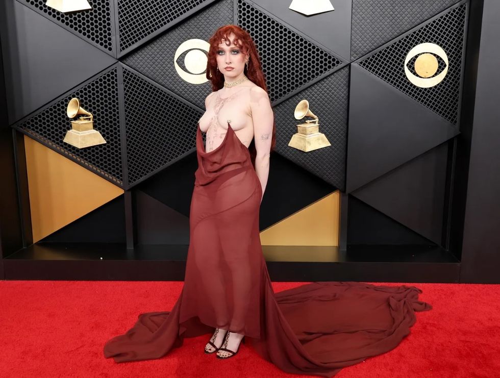 Chappell Roan tërhoqi vëmendje në tapetin e kuq të Grammy Awards 2026 në Los Angeles me një fustan të tejdukshëm.