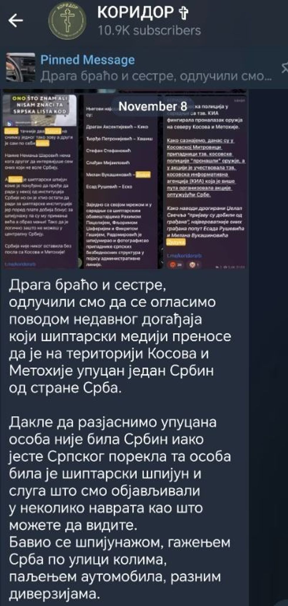 Sot media kryesore përmes së cilës transmetohen kërcënimet e grupit të Radoiçiqit është kanali në Telegram “Koridor”, ku pothuajse çdo ditë mund të shihen mesazhe mbështetëse për komandantin nga Banjska, por edhe kërcënime ndaj atyre që nuk e pranojnë autoritetin e tij.