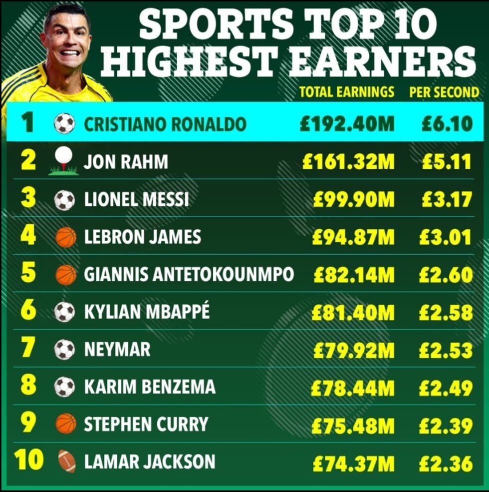 Siç pritej, Ronaldo, kryeson listën, por madhësia e epërsisë së tij është e jashtëzakonshme; në moshën 40 vjeçare, ai fitoi 192.4 milionë funte (222.34 milionë euro), pothuajse dyfishi i 99.9 milionë funteve (115.44 milionë eurove) të Messit.