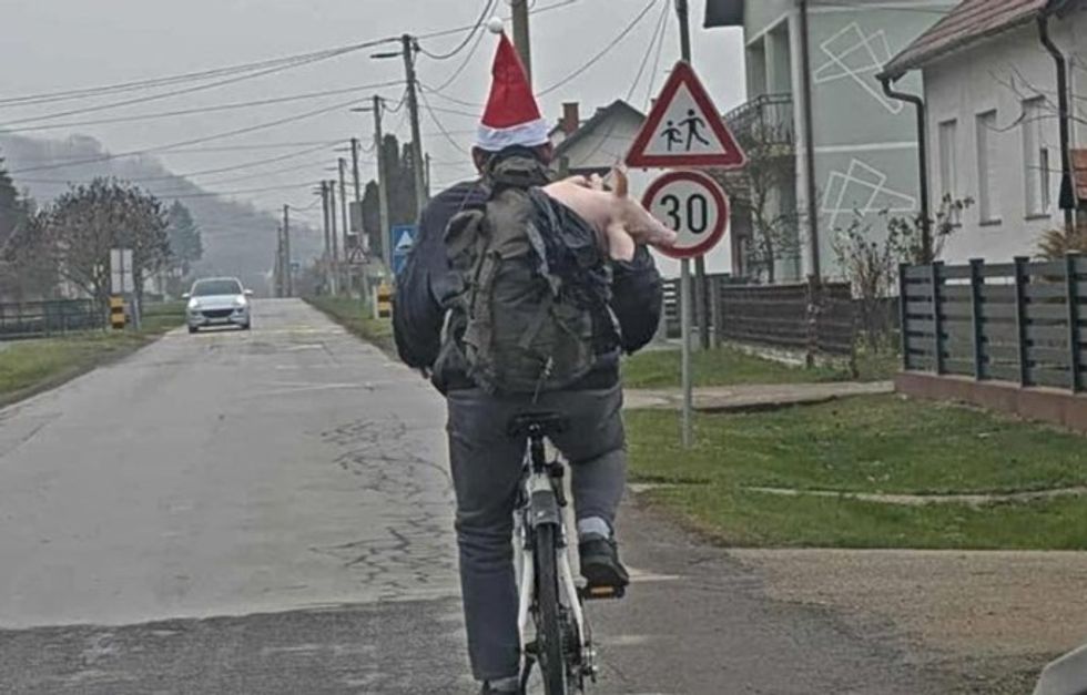 Në një faqe u publikua fotografia e një burri që po udhëtonte me biçikletë, ndërsa në shpinë mbante një çantë shpine nga i cili dukej një derr i vogël.