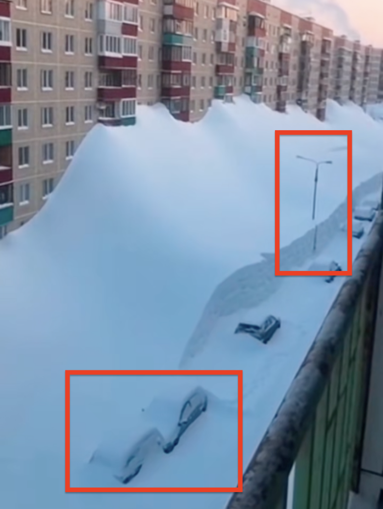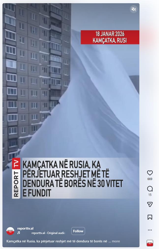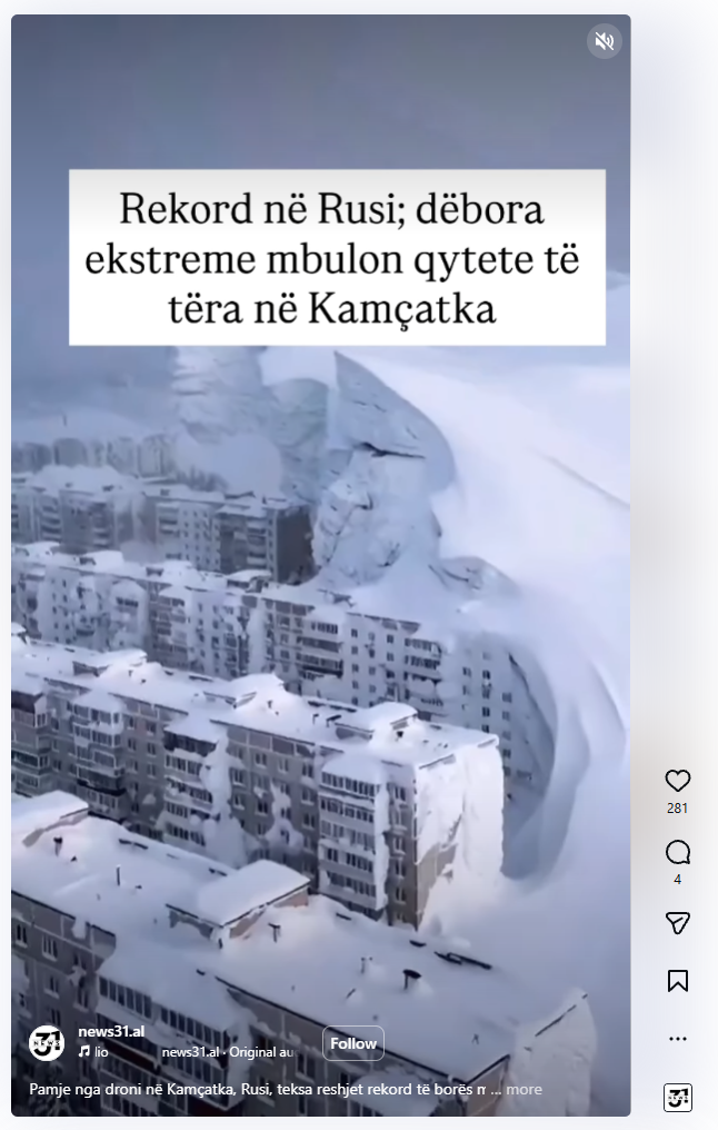 Një video që duket se tregon një grumbull gjigand bore që mbulon pjesën e poshtme të pallateve të banimit po qarkullon në media dhe rrjete sociale me pretendimin se ajo tregon borën që ka rënë në Kamchatka, Rusi në janar 2026.
