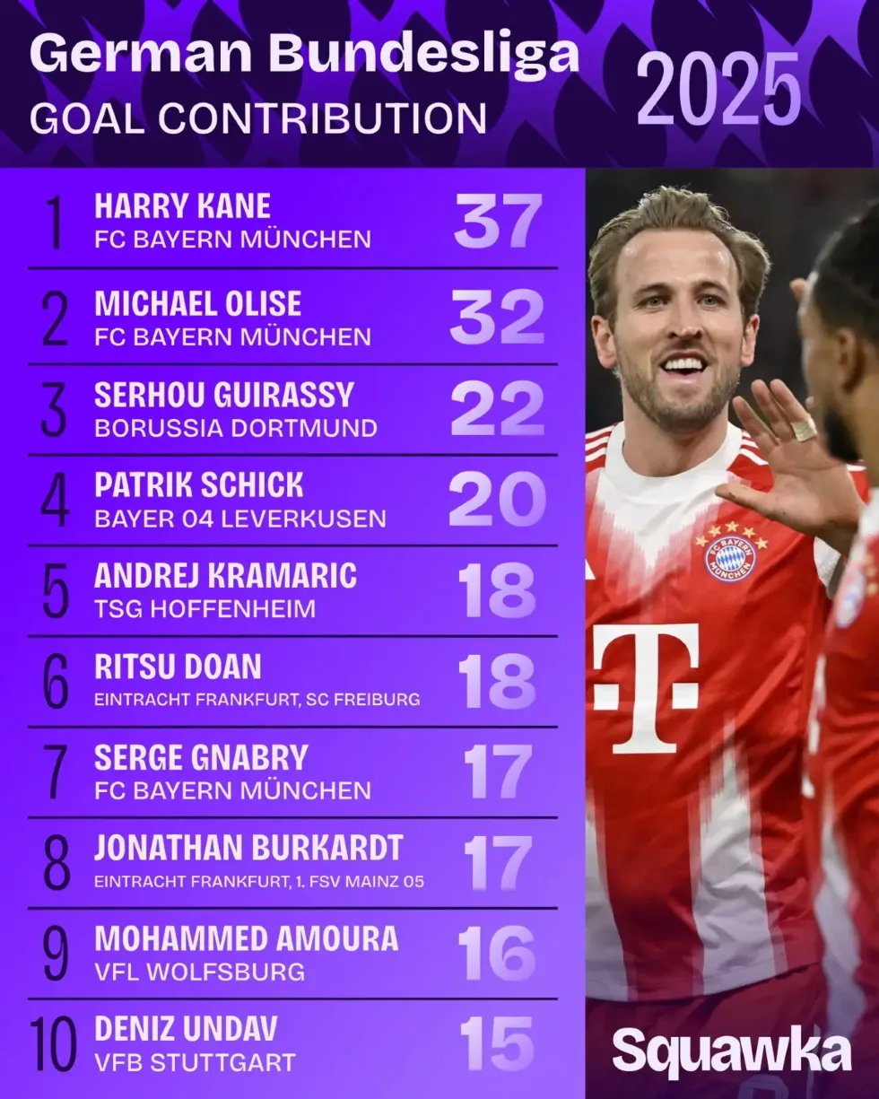 Kane dhe Olise janë dy lojtarët e vetëm që kanë kontribuar në më shumë se 30 gola në Bundesligë në vitin 2025