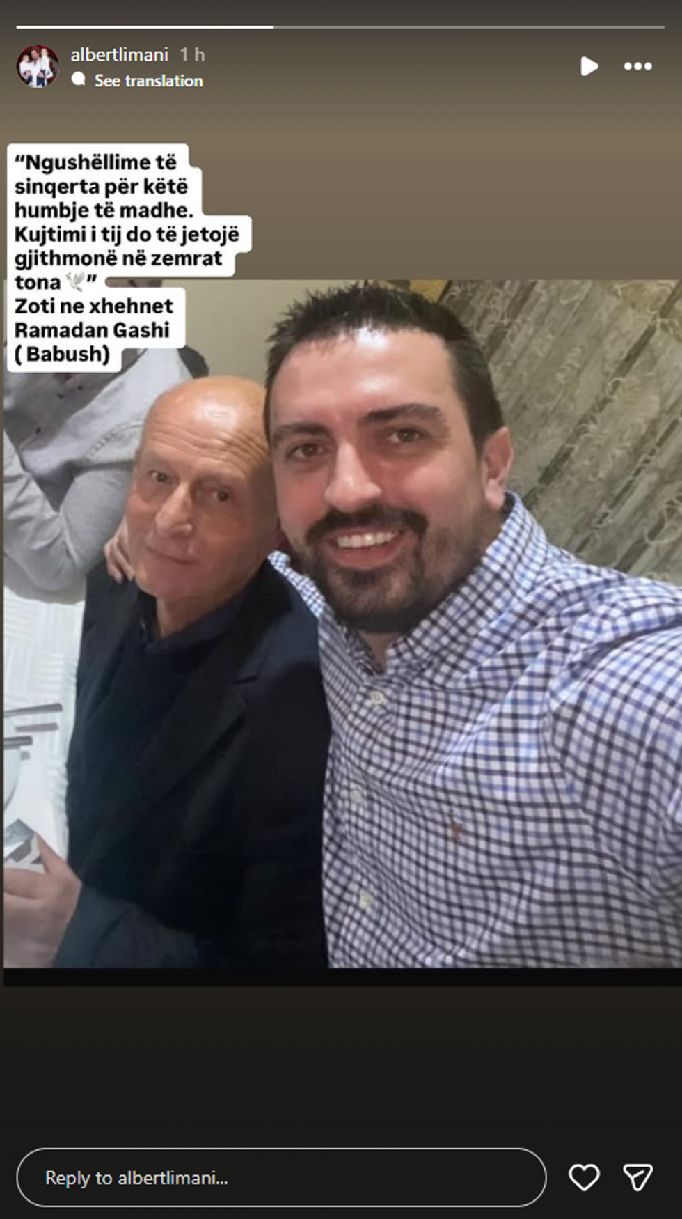 “Ngushëllime të sinqerta për këtë humbje të madhe. Kujtimi i tij do të jetojë gjithmonë në zemrat tona. Zoti në xhehnet, Ramadan Gashi (babush)”, ka shkruar ai.