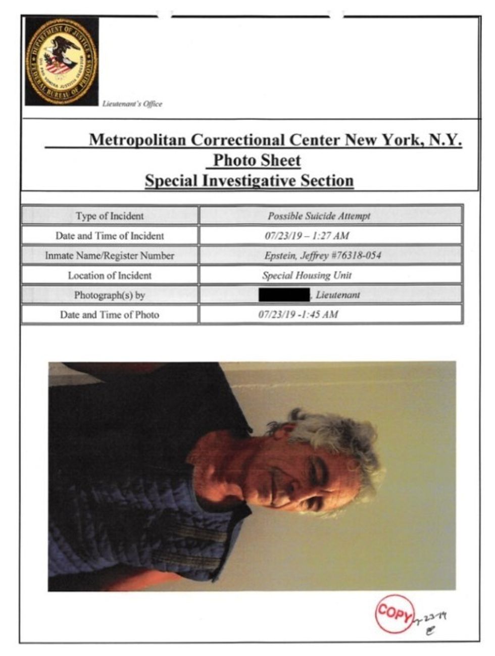 Një tjetër imazh e shfaq Epsteinin me duar të shtrira, ndërsa një i tretë kap pjesën e pasme të kokës dhe qafës së tij.
