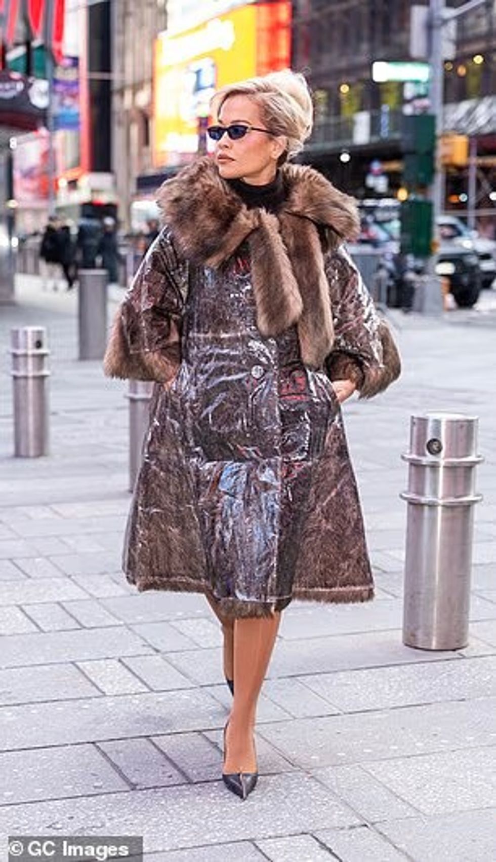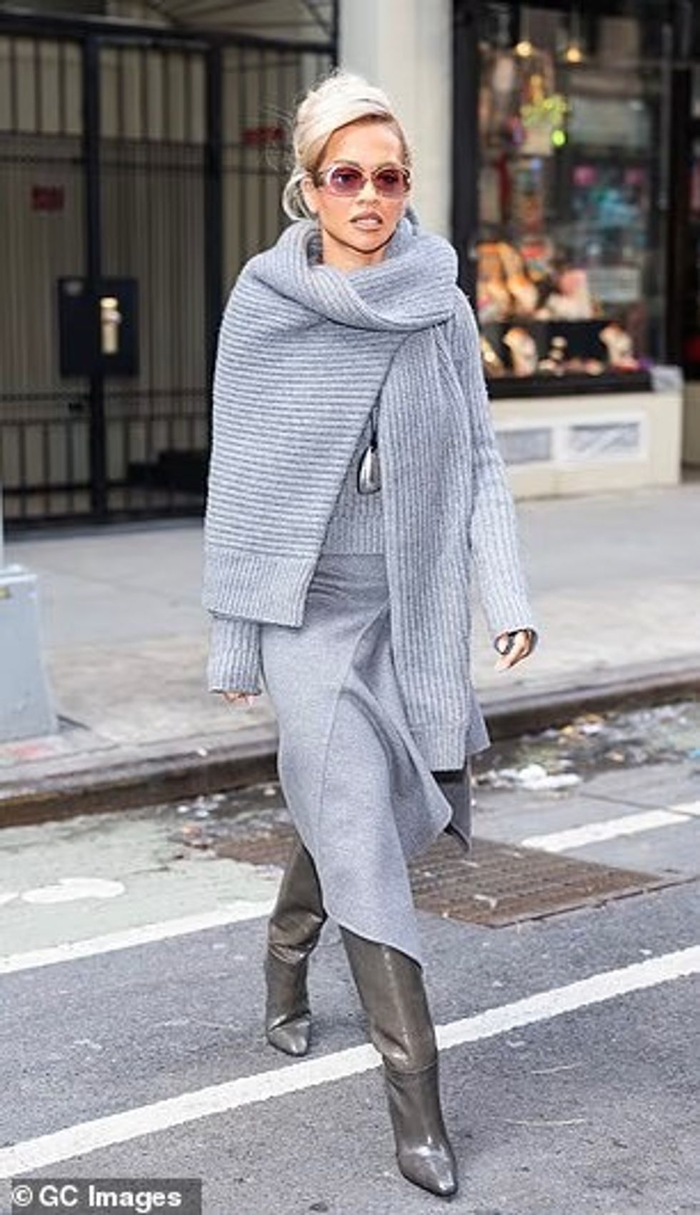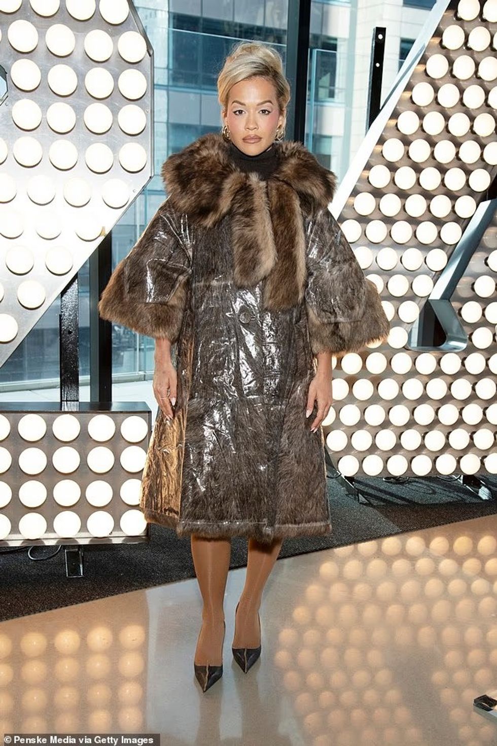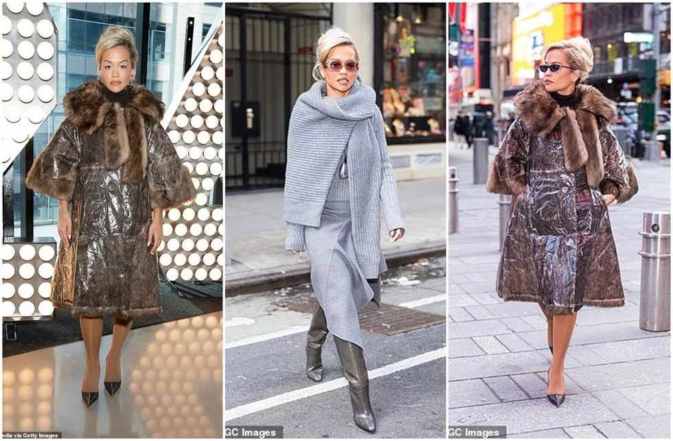 Para ditës së madhe të së mërkures, Rita u pa me një veshje elegante gri, përpara se të shfaqej me një veshje tjetër teksa mori pjesë në konferencën për shtyp me bashkëprezantuesin e saj pranë Times Square Ball.