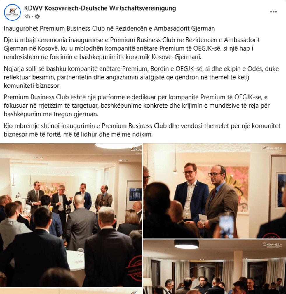 Sipas OEGJK-së, Premium Business Club është një platformë e dedikuar për kompanitë Premium, e fokusuar në rrjetëzim të targetuar, bashkëpunime konkrete dhe krijimin e mundësive të reja për bashkëpunim me tregun gjerman.