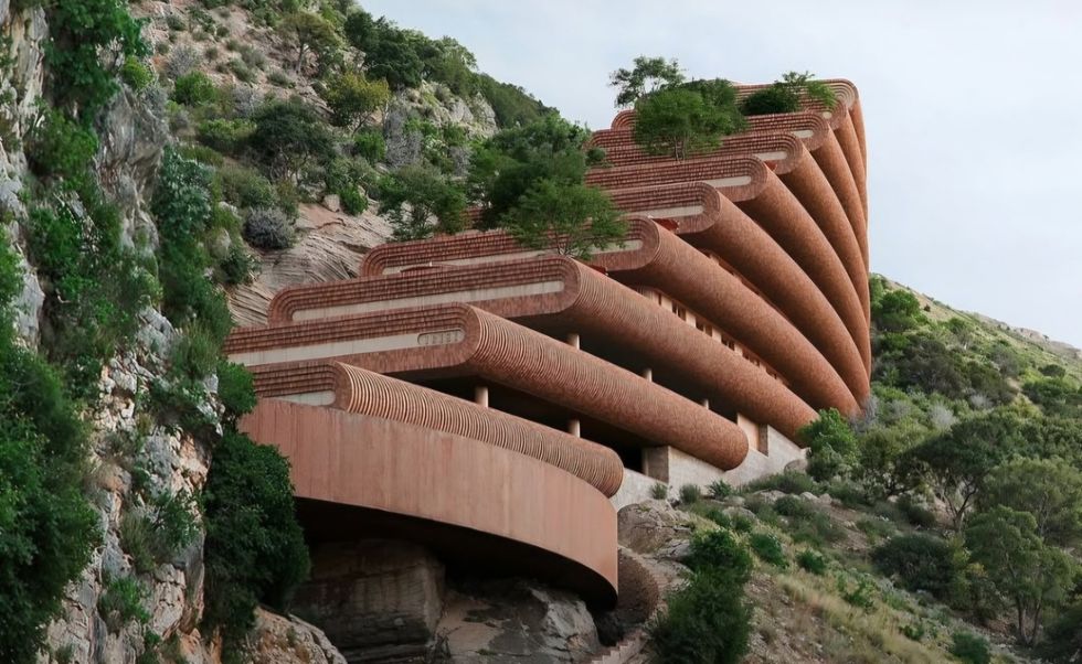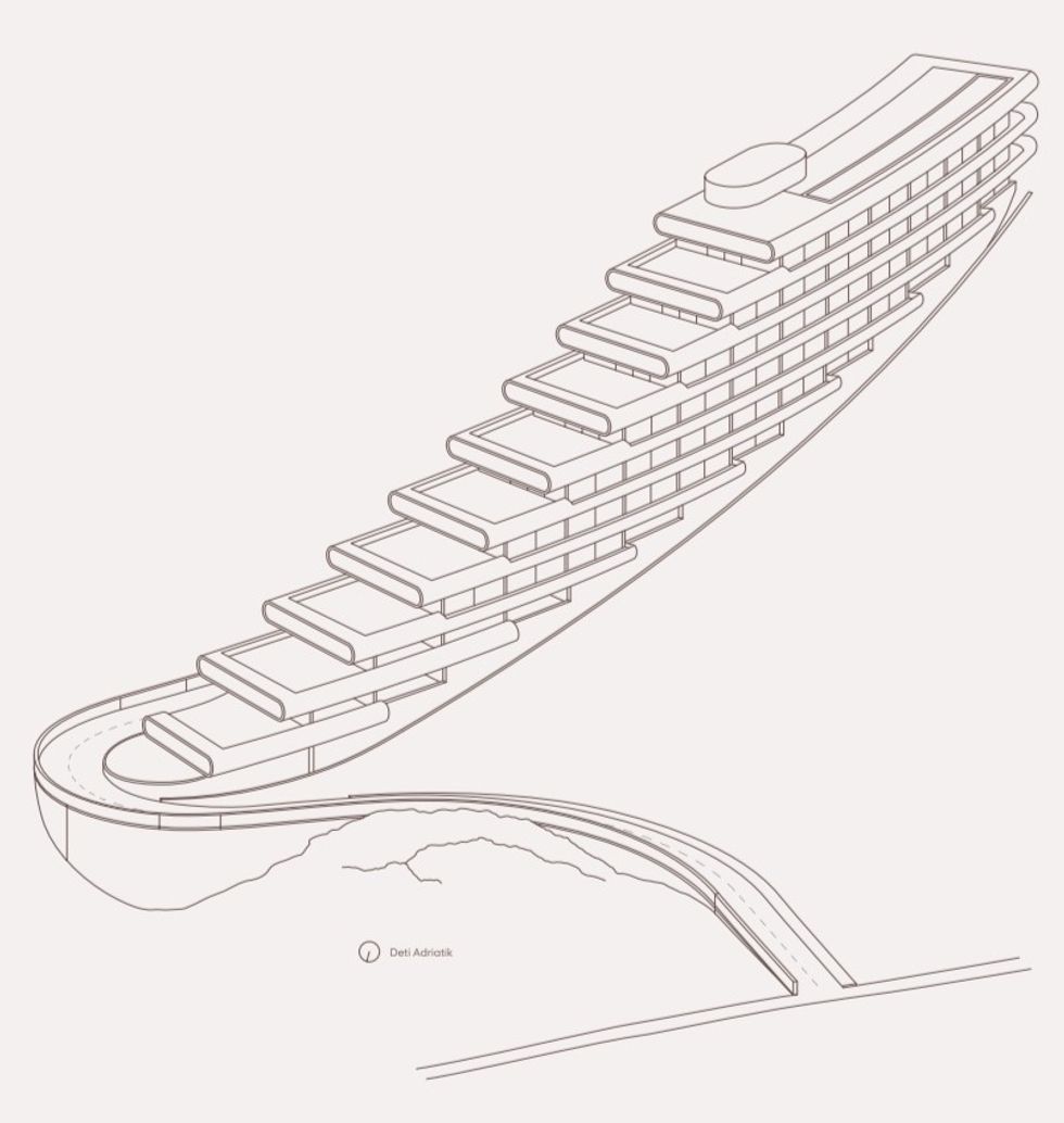 Arkitektura e projektit mban firmën e Studio Precht, e njohur për qasjen e saj të orientuar drejt natyrës dhe qëndrueshmërisë. Forma e ndërtesës ndjek pjerrësinë natyrore të shpatit, ndërsa materialet dhe paleta e ngjyrave pasqyrojnë ambientin shkëmbor dhe gjelbërimin karakteristik të zonës.