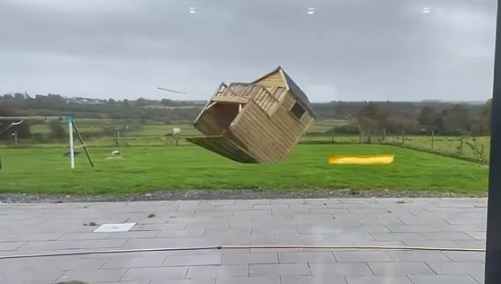 NjĂ« shtĂ«pi lodrash u ngrit nga toka dhe u tĂ«rhoq nĂ«pĂ«r njĂ« oborr nga erĂ«rat qĂ« arritĂ«n deri nĂ« 160 km/h gjatĂ« stuhisĂ« âAmyâ nĂ« Britani.