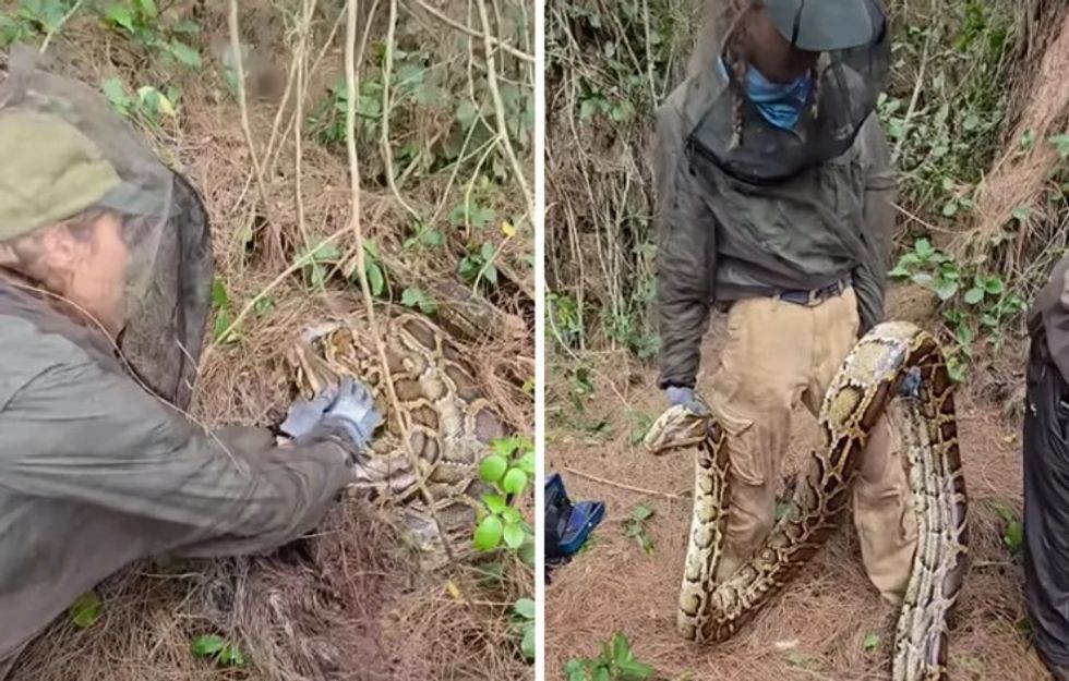 Në video dallohet dashamirësi i gjarpërinjve Kev Pav (@snakeaholic) bashkë me një ekip gjuetarësh duke gjetur një piton gjigant nën degëza. Njëri prej ekspertëve e ngre gjarprin për kokë, ndërkohë që kolegët e tij vëzhgojnë me kujdes çdo lëvizje.