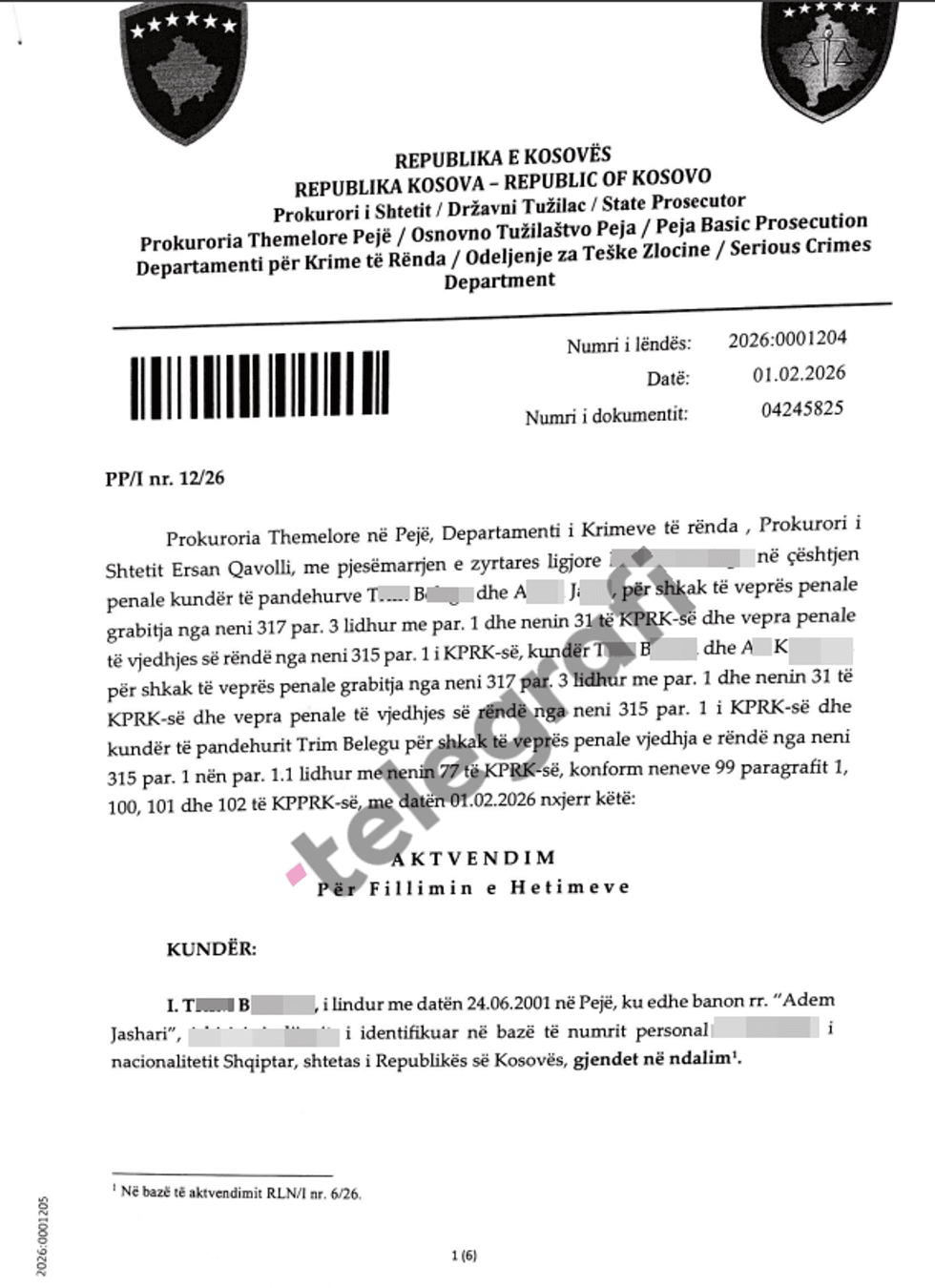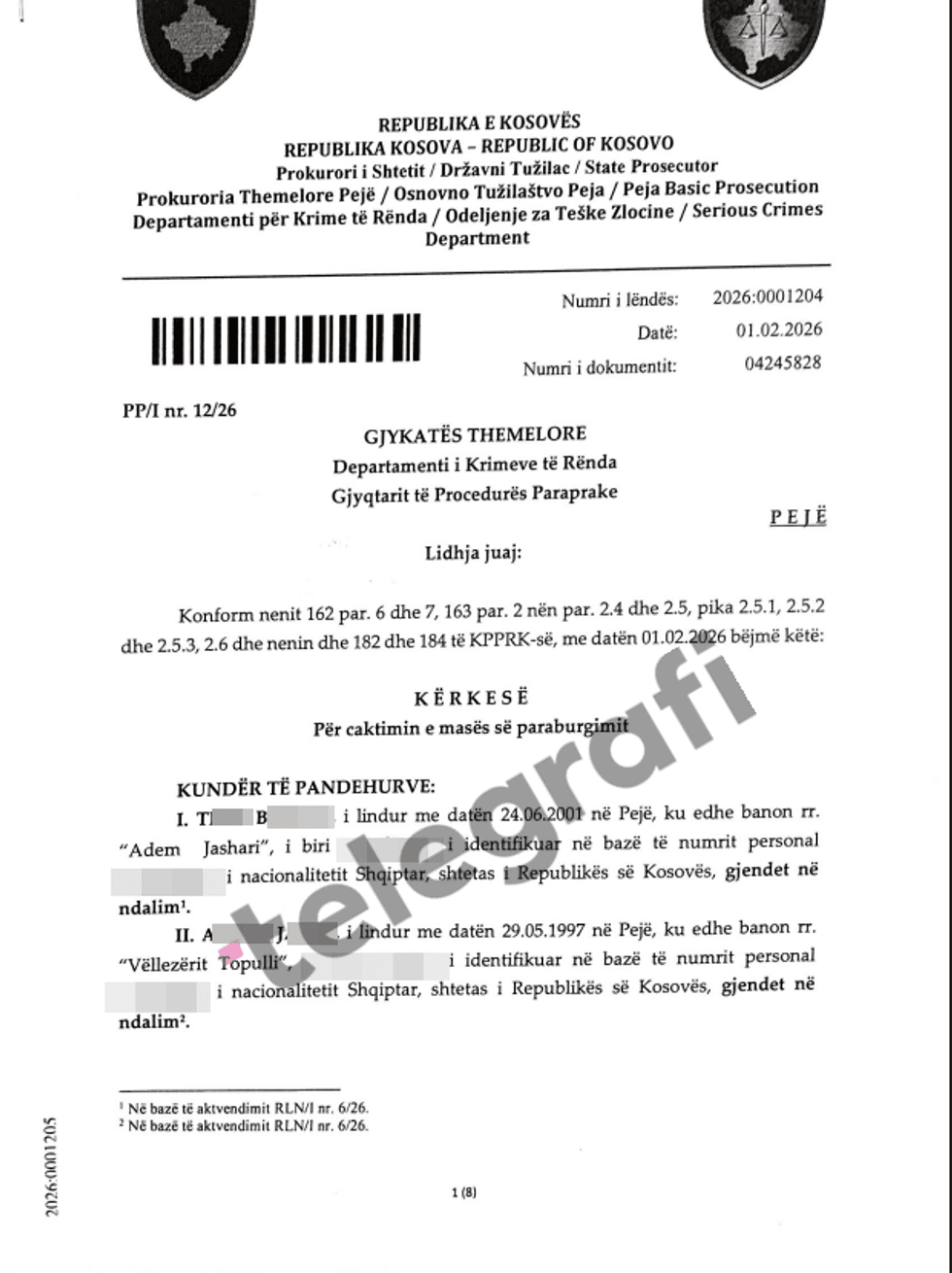 NdĂ«rkaq, sipas aktvendimit pĂ«r fillimin e hetimeve tĂ« nxjerrĂ« mĂ« 1 shkurt 2026 nga Prokuroria Themelore nĂ« PejĂ« â Departamenti pĂ«r Krime tĂ« RĂ«nda, hetimet penale nuk pĂ«rfshijnĂ« vetĂ«m dy tĂ« dyshuarit qĂ« ndodhen nĂ« ndalim, por edhe njĂ« person tĂ« tretĂ«, i cili aktualisht gjendet nĂ« arrati.