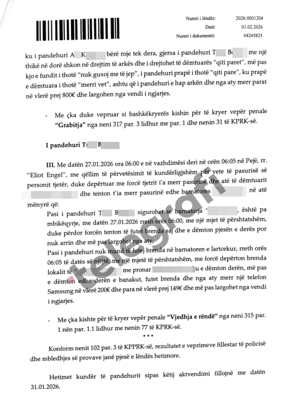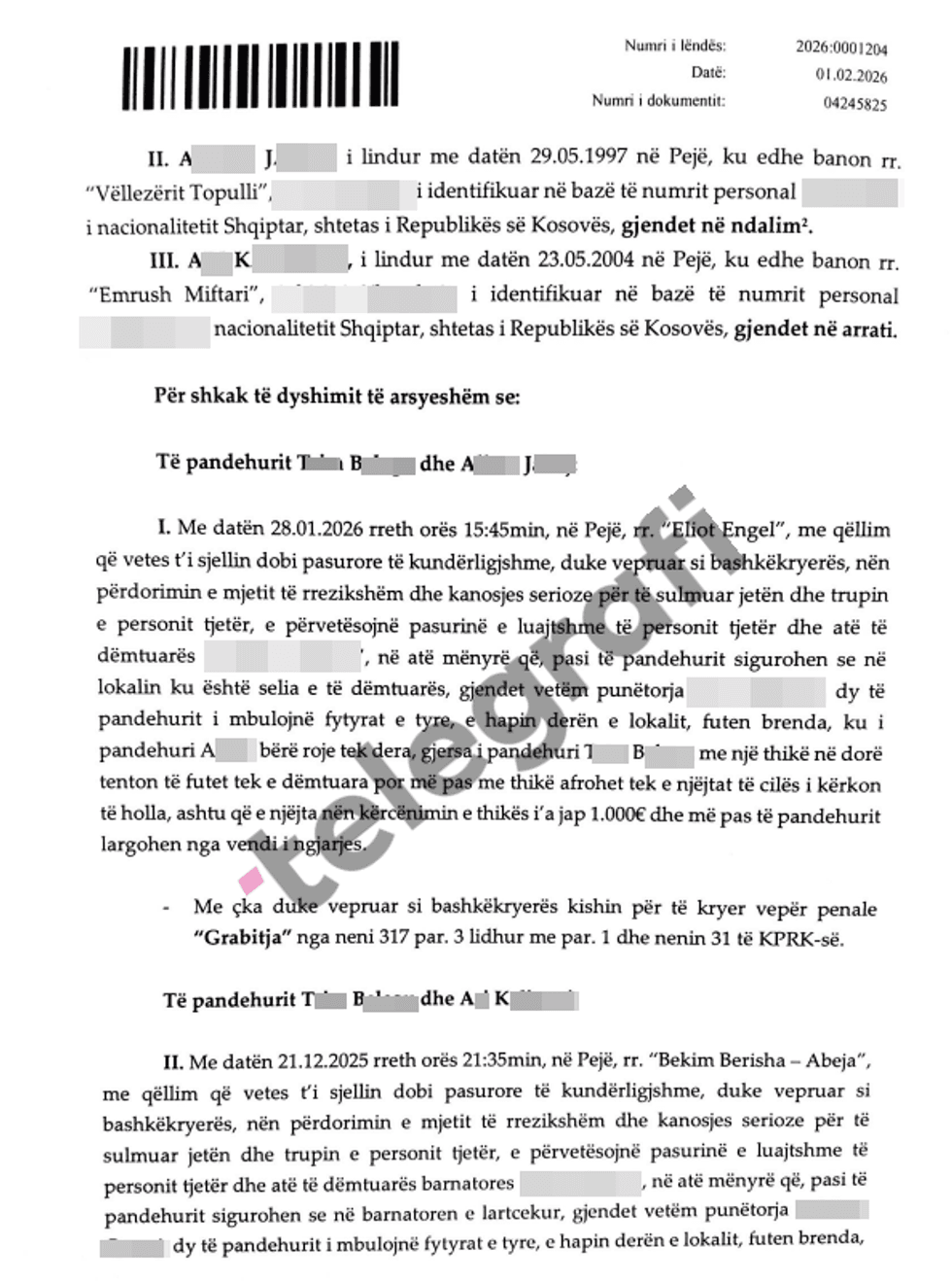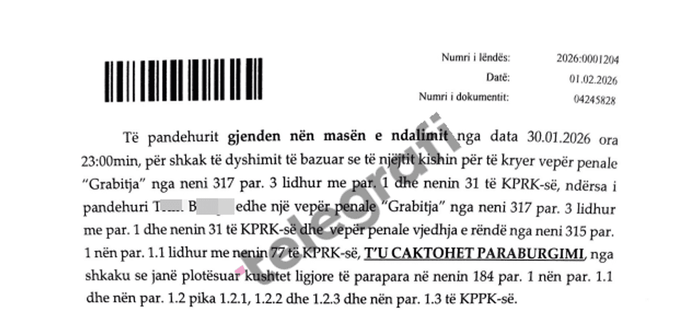 Nga dosja e siguruar nga Telegrafi, thuhet se tĂ« dyshuarit ndodhen nĂ« ndalim nga data 30 janar 2026, rreth orĂ«s 23:00, pĂ«r shkak tĂ« dyshimit tĂ« bazuar se kanĂ« kryer veprĂ«n penale âGrabitjaâ, sipas nenit 317 tĂ« Kodit Penal tĂ« RepublikĂ«s sĂ« KosovĂ«s.