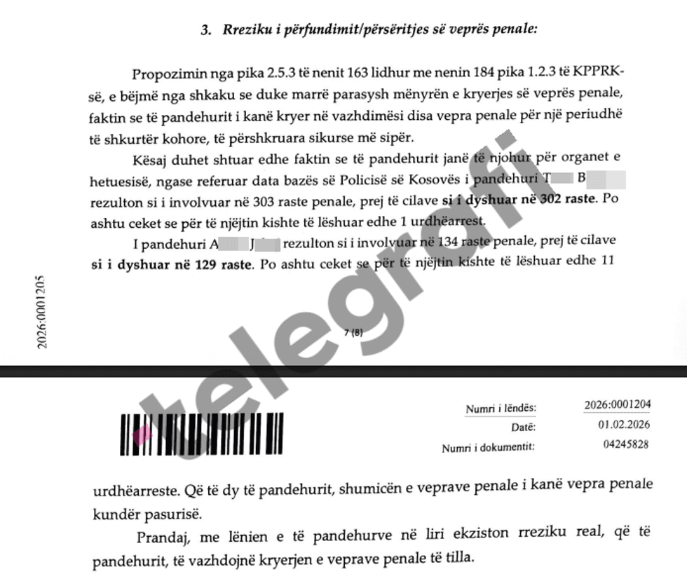 âReferuar data bazĂ«s sĂ« PolicisĂ« sĂ« KosovĂ«s i pandehuri T.B rezulton si i involvuar nĂ« 303 raste penale, prej tĂ« cilave si i dyshuar nĂ« 302 raste. Po ashtu ceket se pĂ«r tĂ« njĂ«jtin kishte tĂ« lĂ«shuar edhe 1 urdhĂ«arrest. I pandehuri A.J rezulton si i involvuar nĂ« 134 raste penale, prej tĂ« cilave si i dyshuar nĂ« 129 raste. Po ashtu ceket se pĂ«r tĂ« njĂ«jtin kishte tĂ« lĂ«shuar edhe 11 urdhĂ«arreste. QĂ« tĂ« dy tĂ« pandehurit, shumicĂ«n e veprave penale i kanĂ« vepra penale kundĂ«r pasurisĂ«. Prandaj, me lĂ«nien e tĂ« pandehurve nĂ« liri ekziston rreziku real, qĂ« tĂ« pandehurit, tĂ« vazhdojnĂ« kryerjen e veprave penale tĂ« tillaâ, thuhet nĂ« dosje.