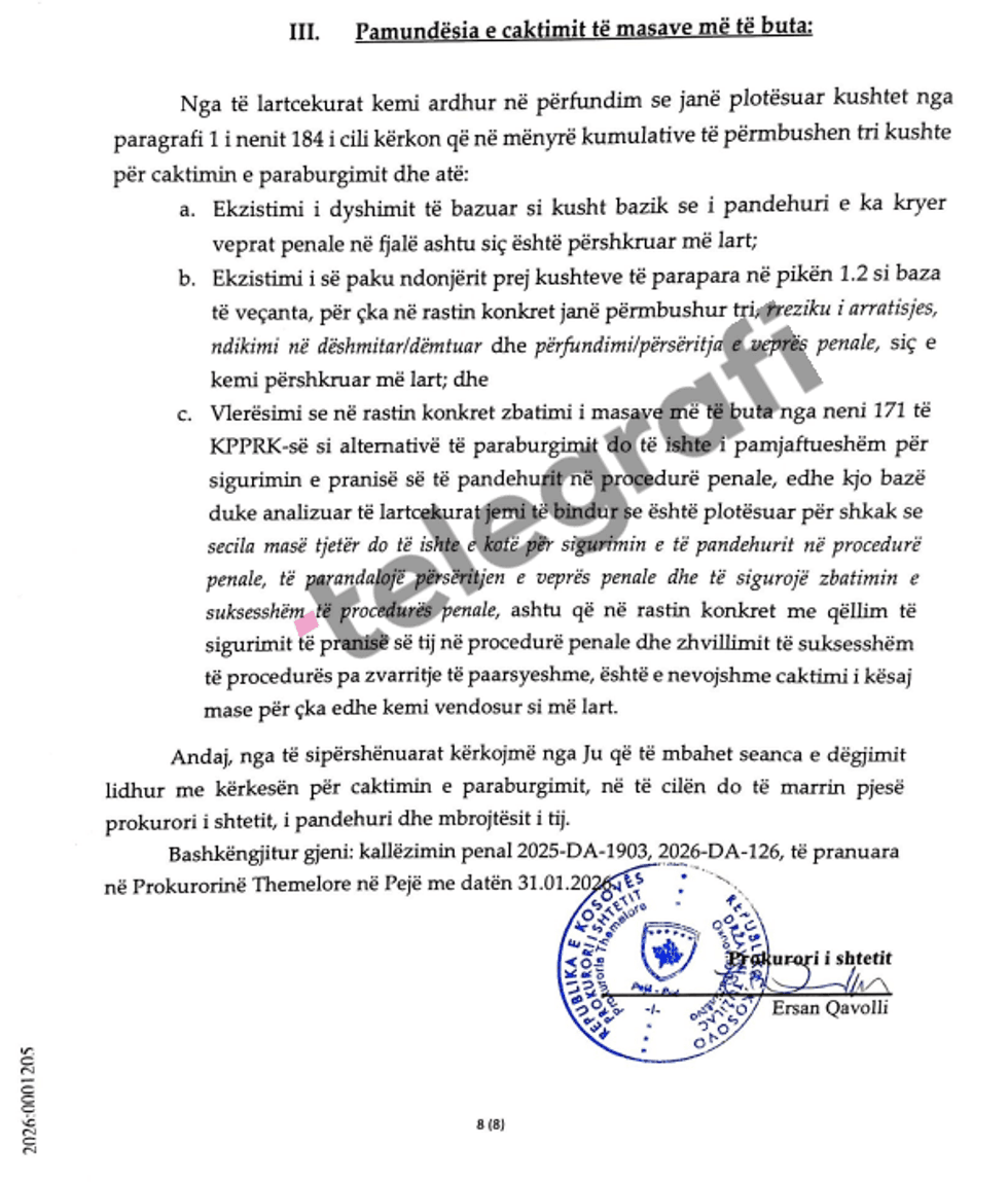Prokuroria vlerëson se në këtë rast janë përmbushur kushtet ligjore për caktimin e paraburgimit, për shkak të rrezikut të arratisjes.