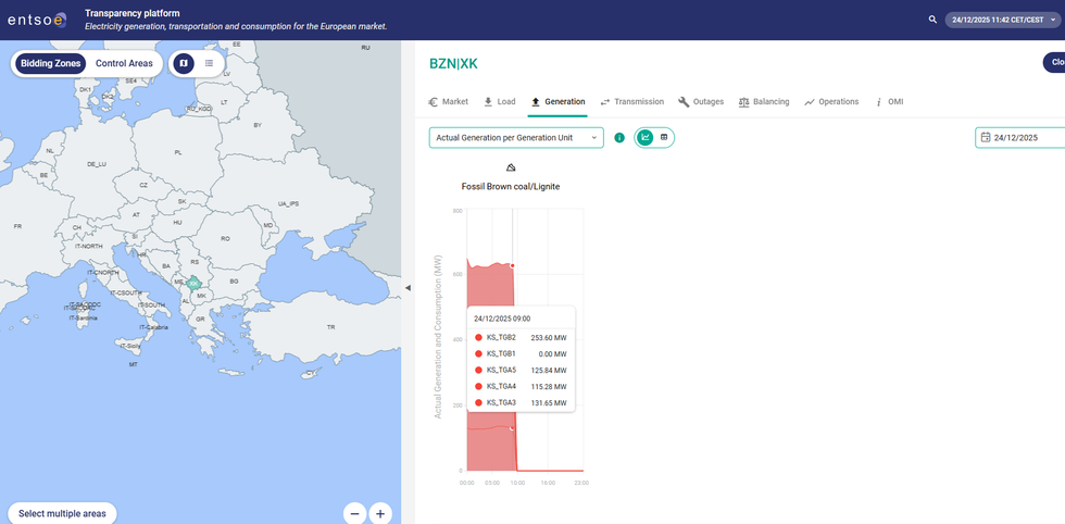 Blloku B1 i Termocentralit Kosova B ka dalë jashtë funksionit që nga mëngjesi i së mërkurës, sipas të dhënave të publikuara nga Rrjeti Evropian i Operatorëve të Sistemeve të Transmetimit për Energji Elektrike (ENTSO-e).