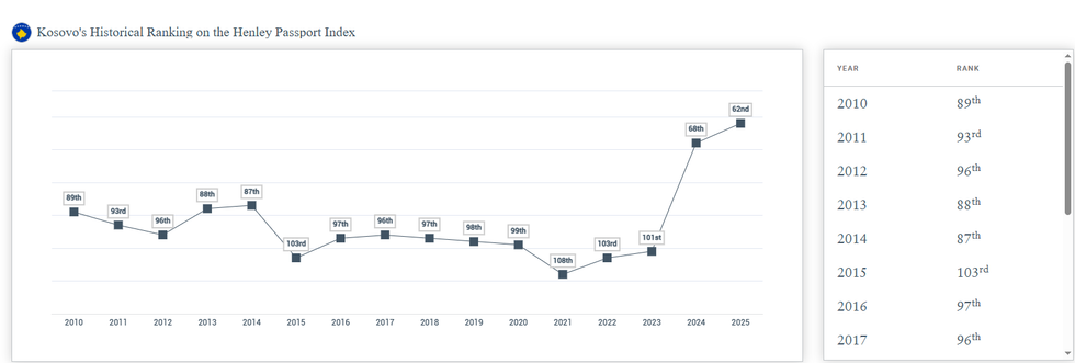 Kosova ka shënuar përparim në Indeksin e Pasaportave Henley, një renditje ndërkombëtare që mat fuqinë e pasaportave, duke u renditur tani në vendin e 62-të globalisht.
