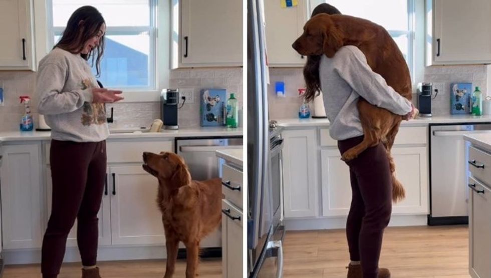 Një video e një qeni të madh që dëshiron të mbahet në krahë si një bebe çdo mëngjes ka bërë bujë në rrjetet sociale.