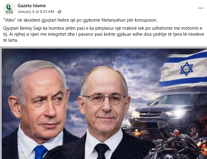 rrjete sociale, përfshi ato shqipfolëse, po qarkullon lajmi se gjyqtari izraelit Benny Sagi, i cili pretendohet se po gjykonte kryeministrin izraelit Benjamin Netanyahun për korrupsion, ka vdekur në një aksident.