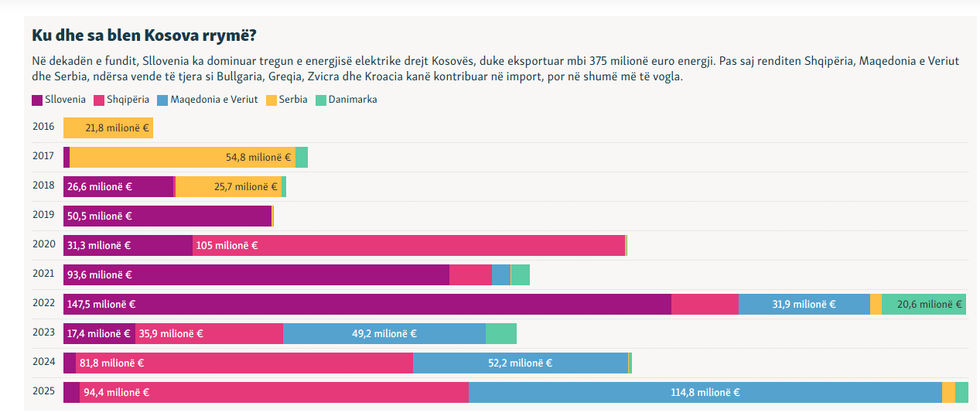 Viti 2022 shĂ«non kulmin e importit, me mbi 218 milionĂ« euro energji tĂ« blerĂ«, ndĂ«rsa edhe viti 2025 (janarânĂ«ntor) paraqet rritje tĂ« ndjeshme, me 247.8 milionĂ« euro importe, niveli mĂ« i lartĂ« i regjistruar deri tani.