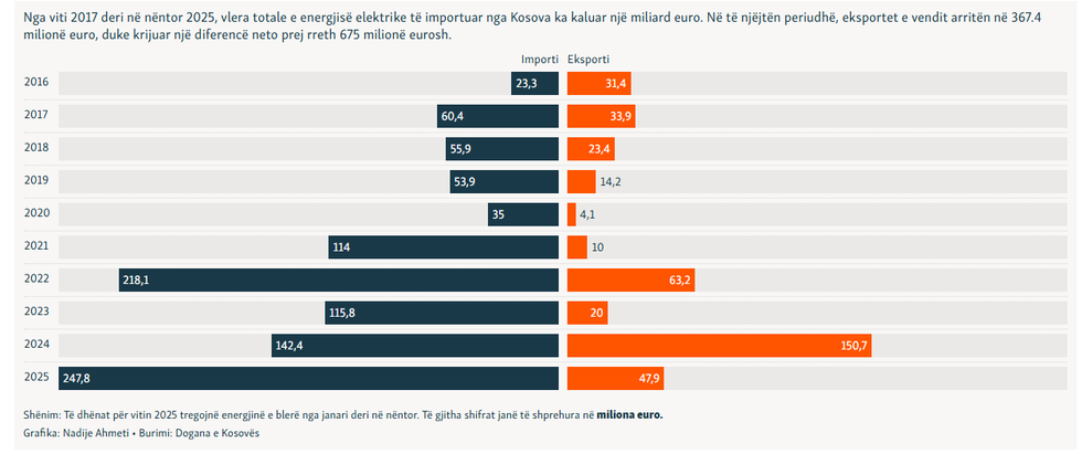 Kosova ka shpenzuar mbi një miliard euro për import të energjisë elektrike nga viti 2017 deri në nëntor 2025, duke thelluar varësinë nga tregjet e jashtme dhe duke krijuar një deficit të madh tregtar në sektorin e energjisë.