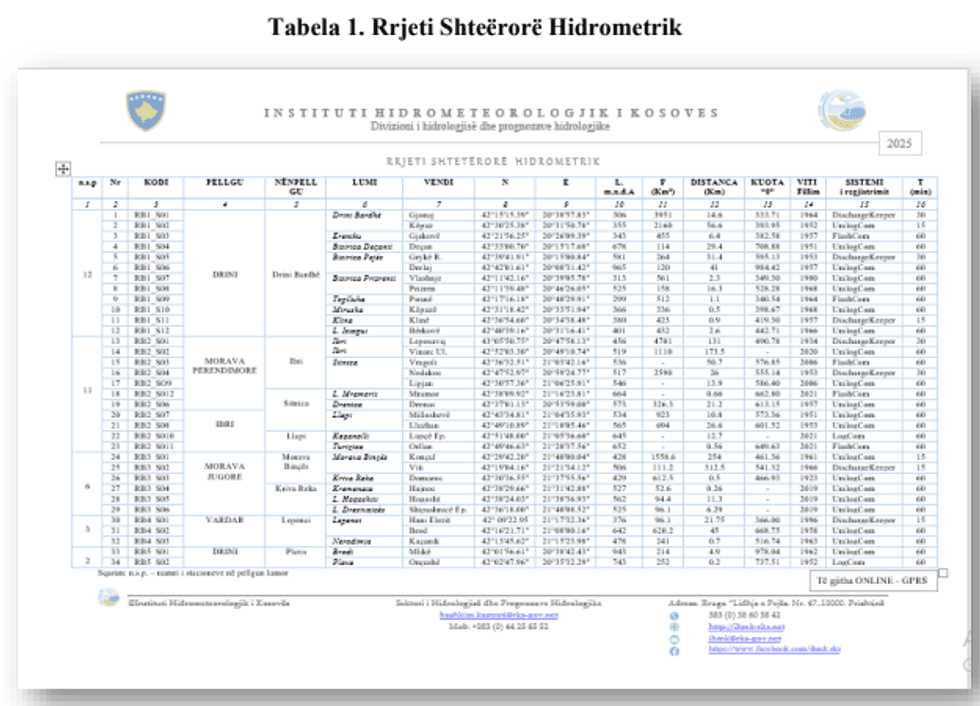Tutje në njoftim thuhet se Instituti Hidrometeorologjik i Kosovës (sektori i hidrologjisë), deri para situatës me përmbytje, ka operuar me një numër prej 34 stacionesh automatike Hidrometrike (GPRS), të cilat janë të vendosura në të gjitha pellgjet, duke përfshi lumenjtë kryesorë si p.sh: Në pellgun e Drinit të bardhë 12 stacione, Ibri 11, Morava e Binçës me 6, Lepenci 3 dhe lumi plavës me 2 stacione hidrometrike.