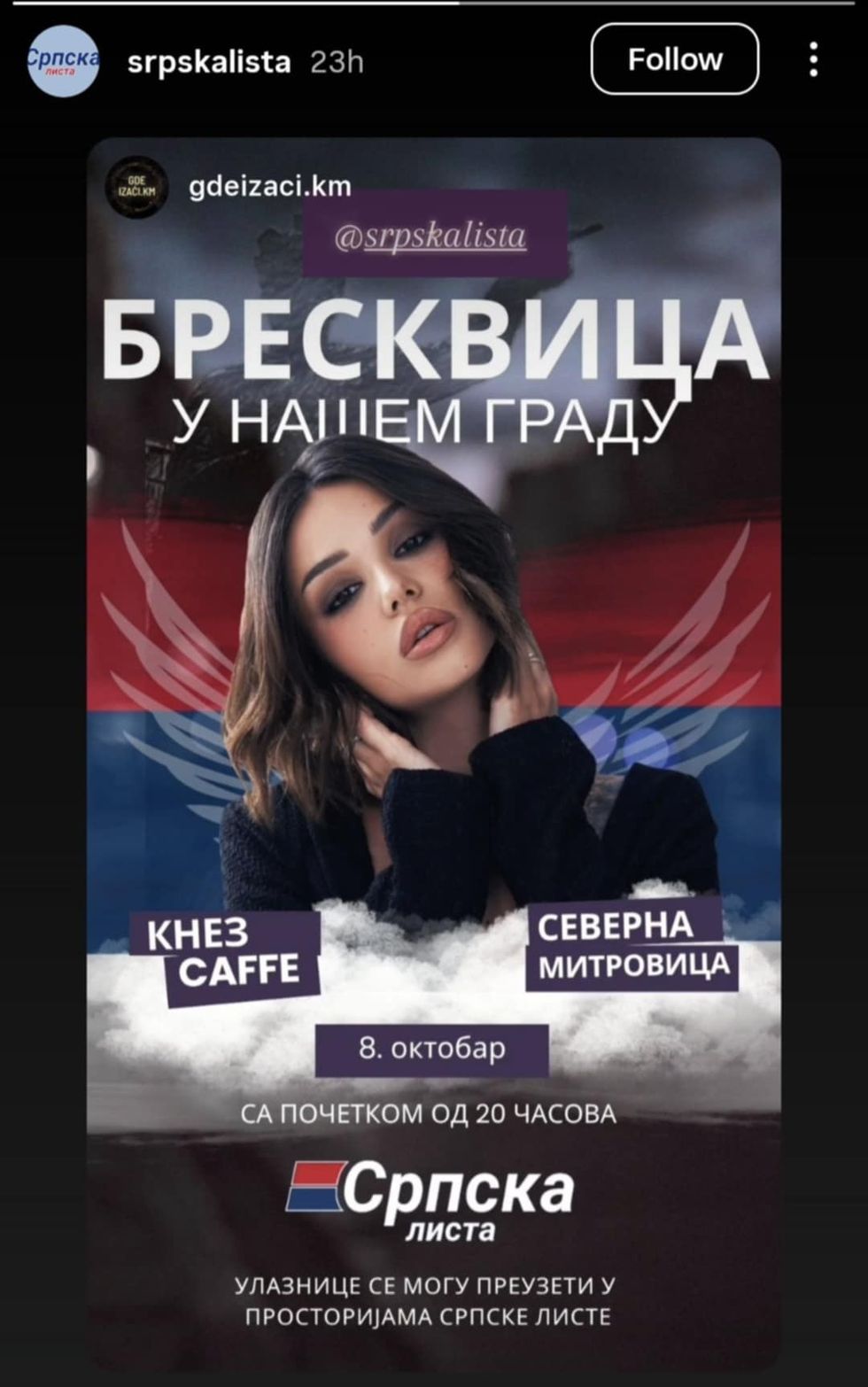 Ngjarja organizohet me logon zyrtare tĂ« ListĂ«s Serbe, e cila nĂ« mĂ«nyrĂ« tĂ« qartĂ« e identifikon kĂ«tĂ« event si pjesĂ« tĂ« agjendĂ«s sĂ« saj politikeâBreskvica nĂ« qytetin tonĂ« â 8 tetor, ora 20:00, Knez Caffe, MitrovicĂ« e Veriutâ si dhe shkruhet se âBiletat mund tĂ« merren nĂ« zyrat e ListĂ«s Serbeâ.